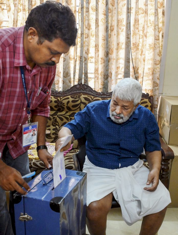 Thiruvananthapuram: Bhaskara Kurup, 86, casts his vote as part of home voting at his residence ahead of the Kerala Legislative Assembly election, in Thiruvananthapuram, Monday, March 30, 2026. (PTI Photo)(PTI03_30_2026_000092B)