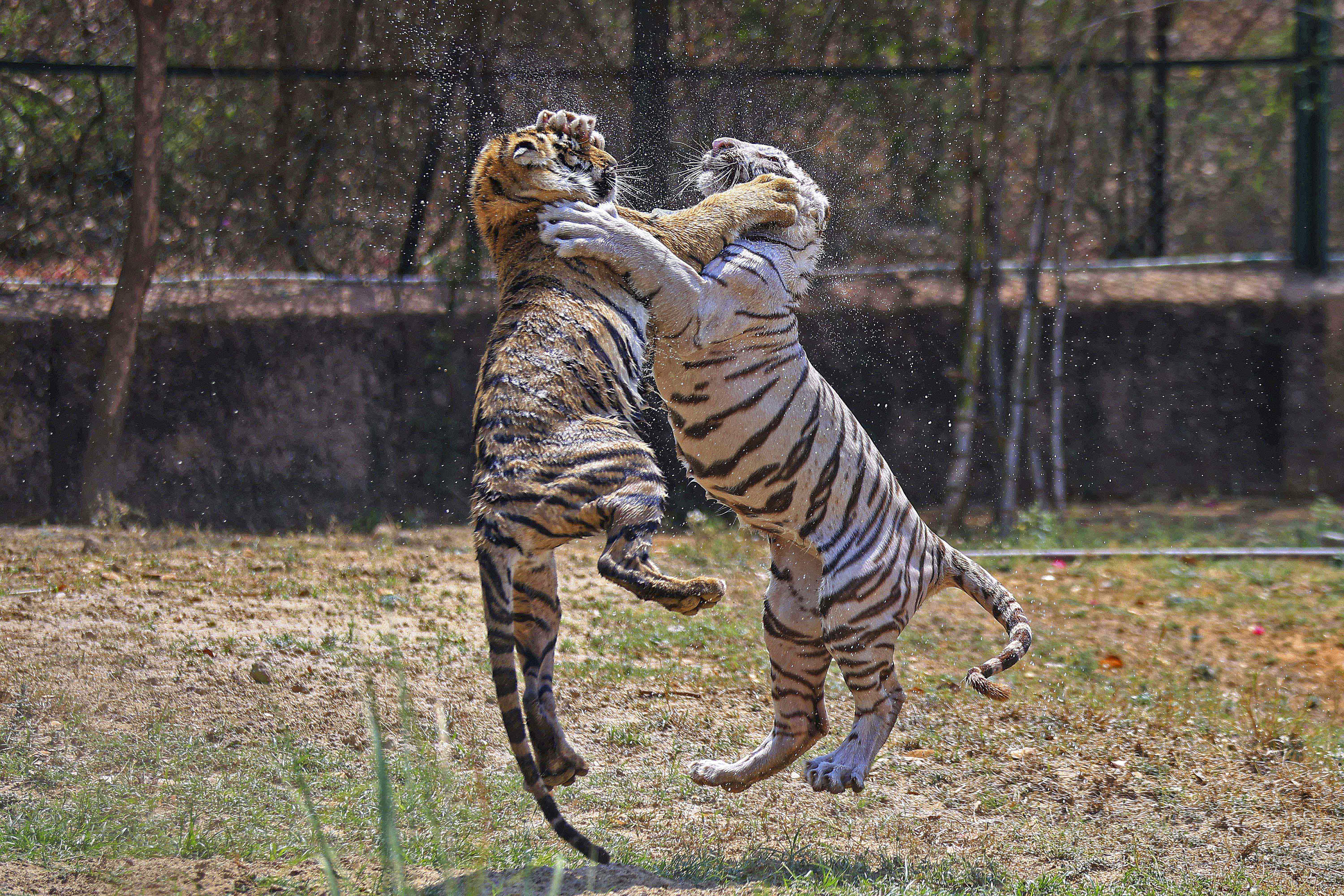 Jaipur: Bengal Tiger male cub Bheem, white, and female cub Skandi play inside their enclosure on a hot summer day, at the Nahargarh Biological Park in Jaipur, Thursday, April 17, 2025. (PTI Photo) (PTI04_17_2025_000113B)