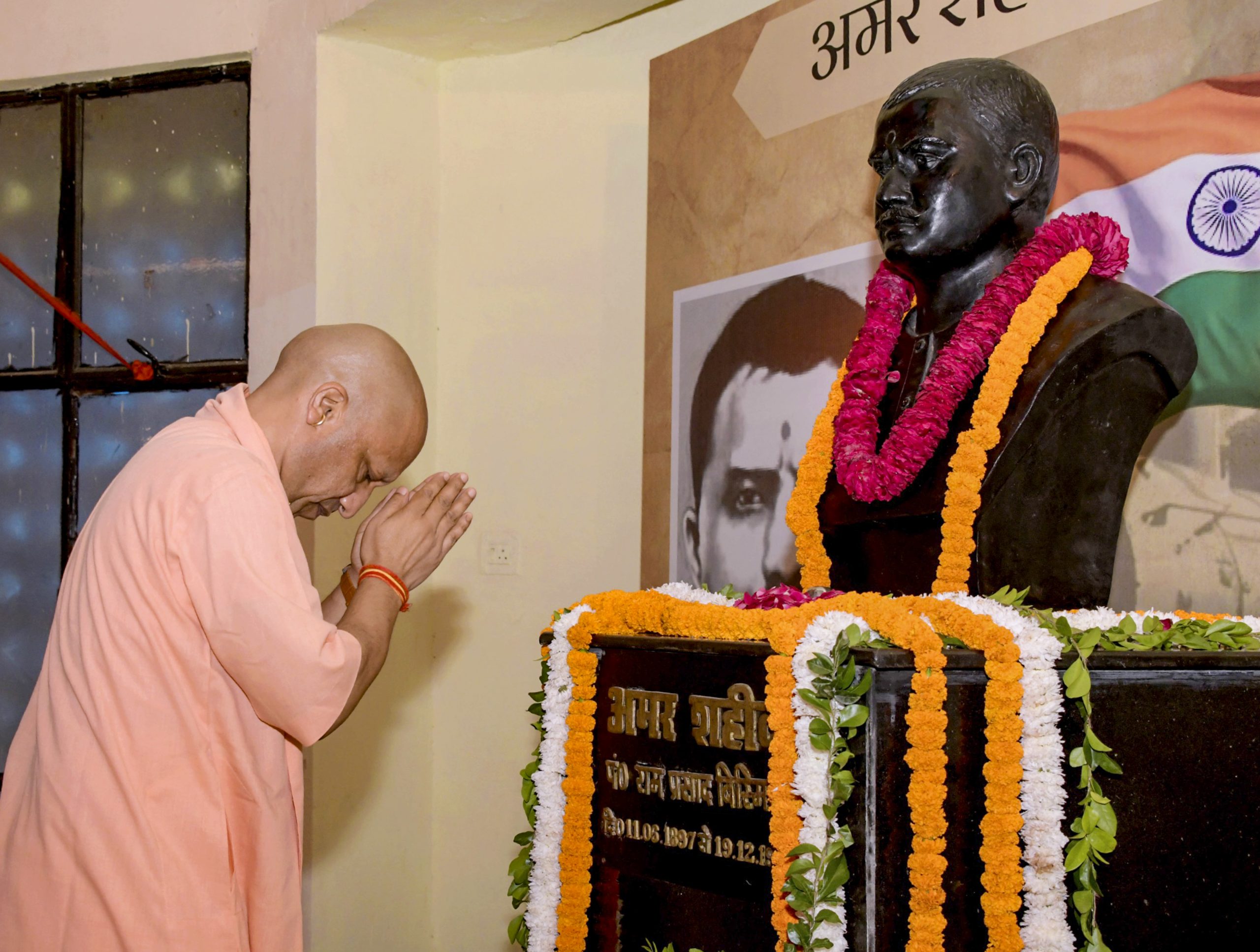 Lucknow: Uttar Pradesh Chief Minister Yogi Adityanath pays tribute to freedom fighter Ram Prasad Bismil during the closing ceremony of Kakori Train Action centenary event, in Lucknow, Friday, Aug. 8, 2025. (PTI Photo)(PTI08_08_2025_000122B)