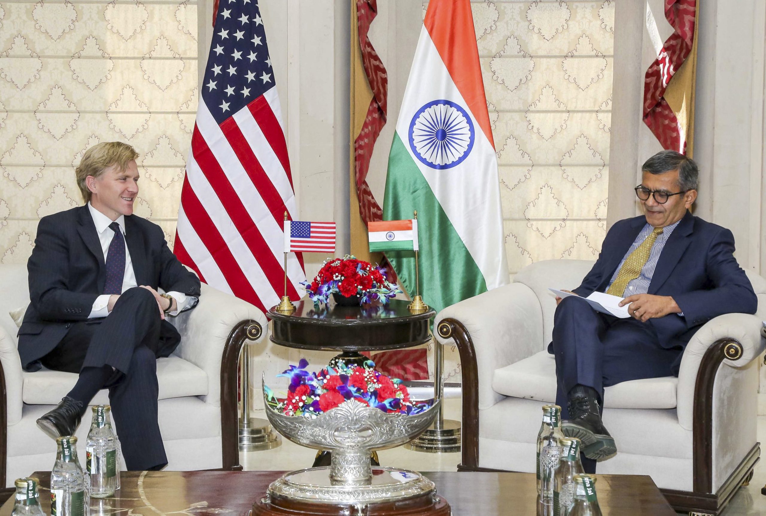 **EDS: THIRD PARTY IMAGE** In this image posted on March 25, 2026, Defence Secretary Rajesh Kumar Singh during a meeting with US Under Secretary of War for Policy Elbridge Colby, on the sidelines of the 18th India-US Defence Policy Group meeting, in New Delhi. (@SpokespersonMoD/X via PTI Photo) (PTI03_25_2026_000420B) *** Local Caption ***