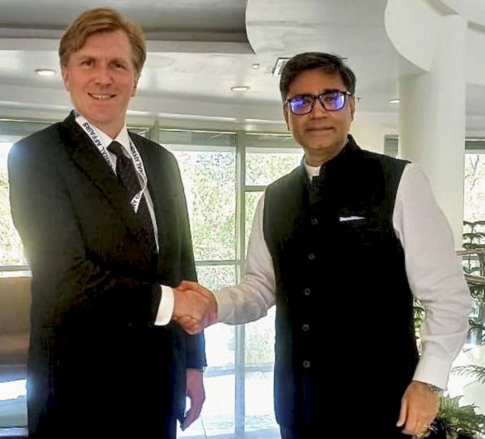 **EDS: THIRD PARTY IMAGE** In this image posted on March 25, 2026, Foreign Secretary Vikram Misri during a meeting with the US Under Secretary of War for Policy Elbridge Colby, on the sidelines of the 18th India-US Defence Policy Group meeting, in New Delhi. (@MEAIndia/X via PTI Photo) (PTI03_25_2026_000411B) *** Local Caption ***