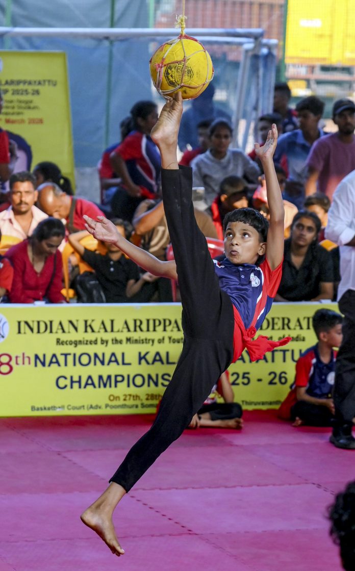 Thiruvananthapuram: A young boy takes part in Chavitti Pongal (a high-kick technique in Kalaripayattu martial-art) competition during the 18th National Kalaripayattu Championship, in Thiruvananthapuram, Kerala, Friday, March 27, 2026. (PTI Photo)(PTI03_27_2026_000377B)