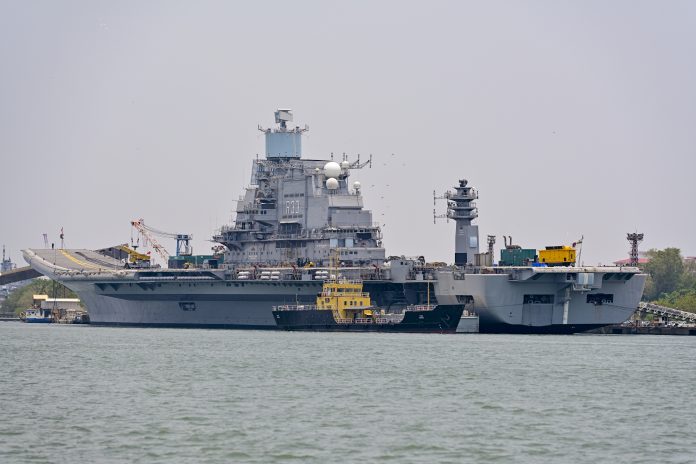 Kochi: Indian Navy's aircraft carrier INS Vikramaditya anchored at port in Kochi, Kerala, Friday, April 11, 2025. (PTI Photo/Kamal Kishore) (PTI04_11_2025_000308B)