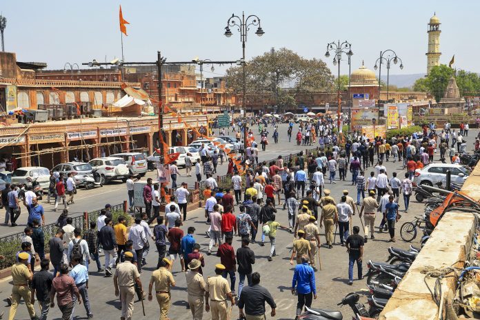 Jaipur: People protest demanding strict action against the accused a day after a speeding SUV car struck multiple pedestrians, killing at least two and seriously injuring several others, in Rajasthan’s Jaipur, Tuesday, April 8, 2025. (PTI Photo)(PTI04_08_2025_000231B)