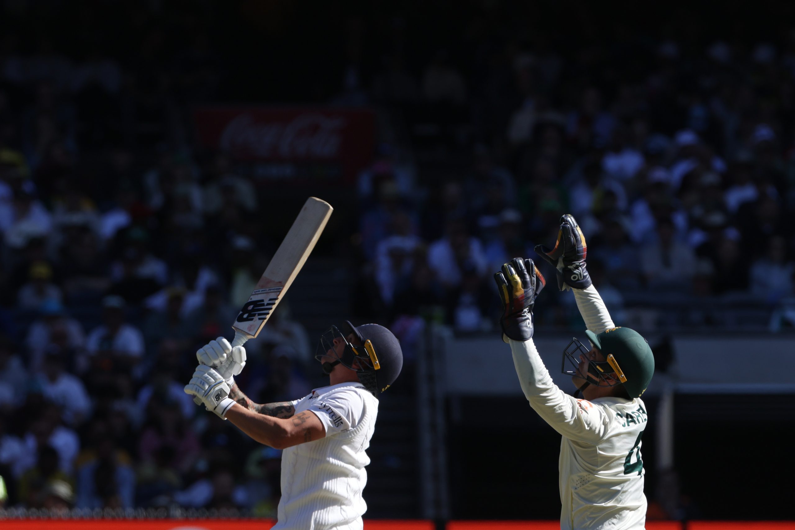 England's Brydon Carse, left, and Australia's Alex Carey watch a shot by Carse that will have him caught out during their Ashes cricket test match in Melbourne, Friday, Dec. 26, 2025. AP/PTI(AP12_26_2025_000063B)