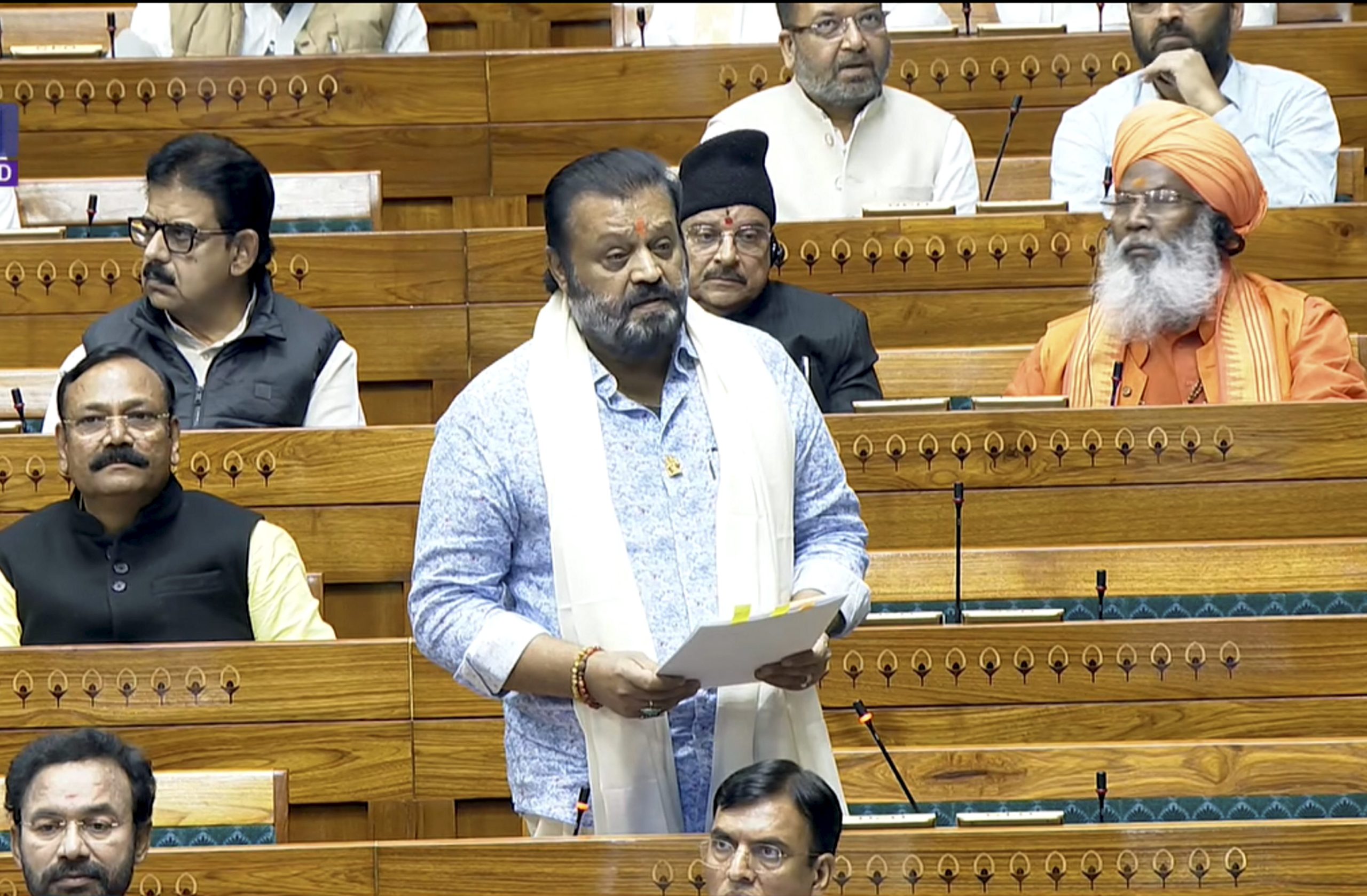 **EDS: THIRD PARTY IMAGE, SCREENGRAB VIA SANSAD TV** New Delhi: Union Minister of State Suresh Gopi speaks in the Lok Sabha during the Budget session of Parliament, in New Delhi, Friday, Feb. 13, 2026. (Sansad TV via PTI Photo)(PTI02_13_2026_000076B) *** Local Caption ***