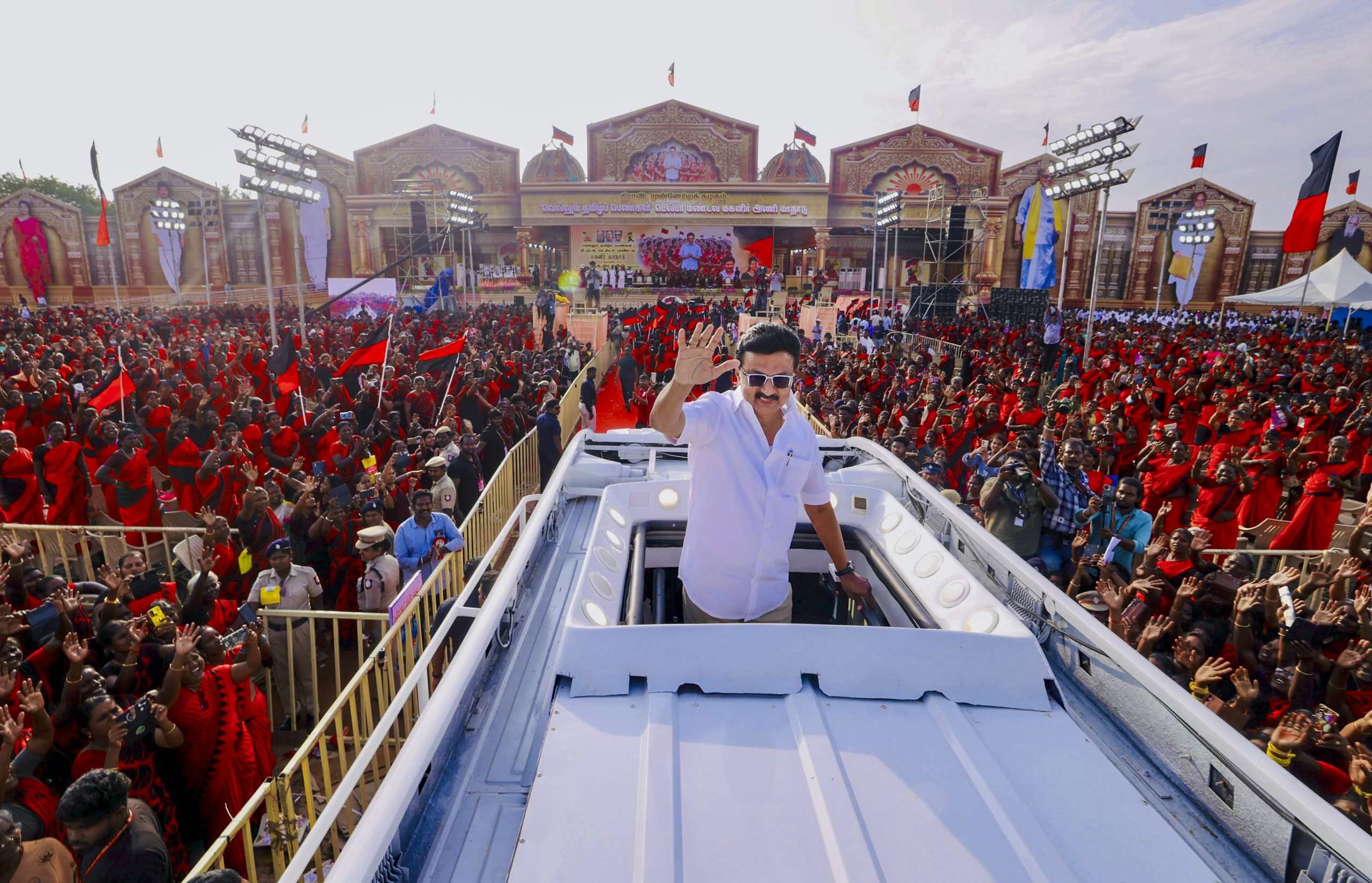 Thanjavur: Tamil Nadu Chief Minister and DMK president MK Stalin during the 'Vellum Tamil Pengal' (Victorious Tamil Women) conference organised by the Women's Wing of the Dravida Munnetra Kazhagam (DMK), in Thanjavur, Tamil Nadu, Monday, Jan. 26, 2026. (PTI Photo)(PTI01_26_2026_000788B)