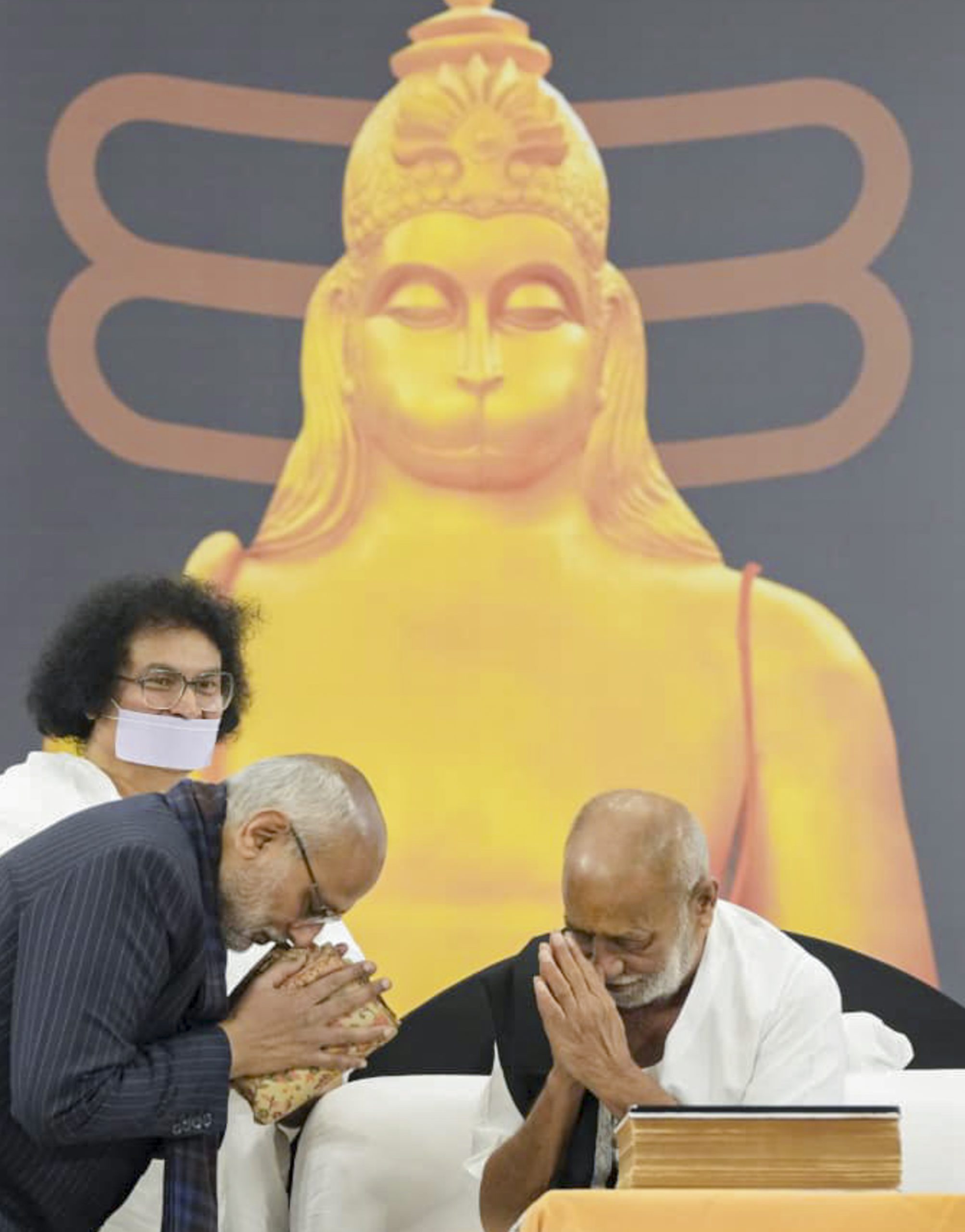 **EDS: THIRD PARTY IMAGE** In this image posted on Jan. 17, 2026, VicePresident CP Radhakrishnan, left, greets spiritual leader Morari Bapu during the inaugural ceremony of 'nine-day Ram Katha', at Bharat Mandapam, in New Delhi. (@VPIndia/X via PTI Photo)(PTI01_17_2026_000459B)