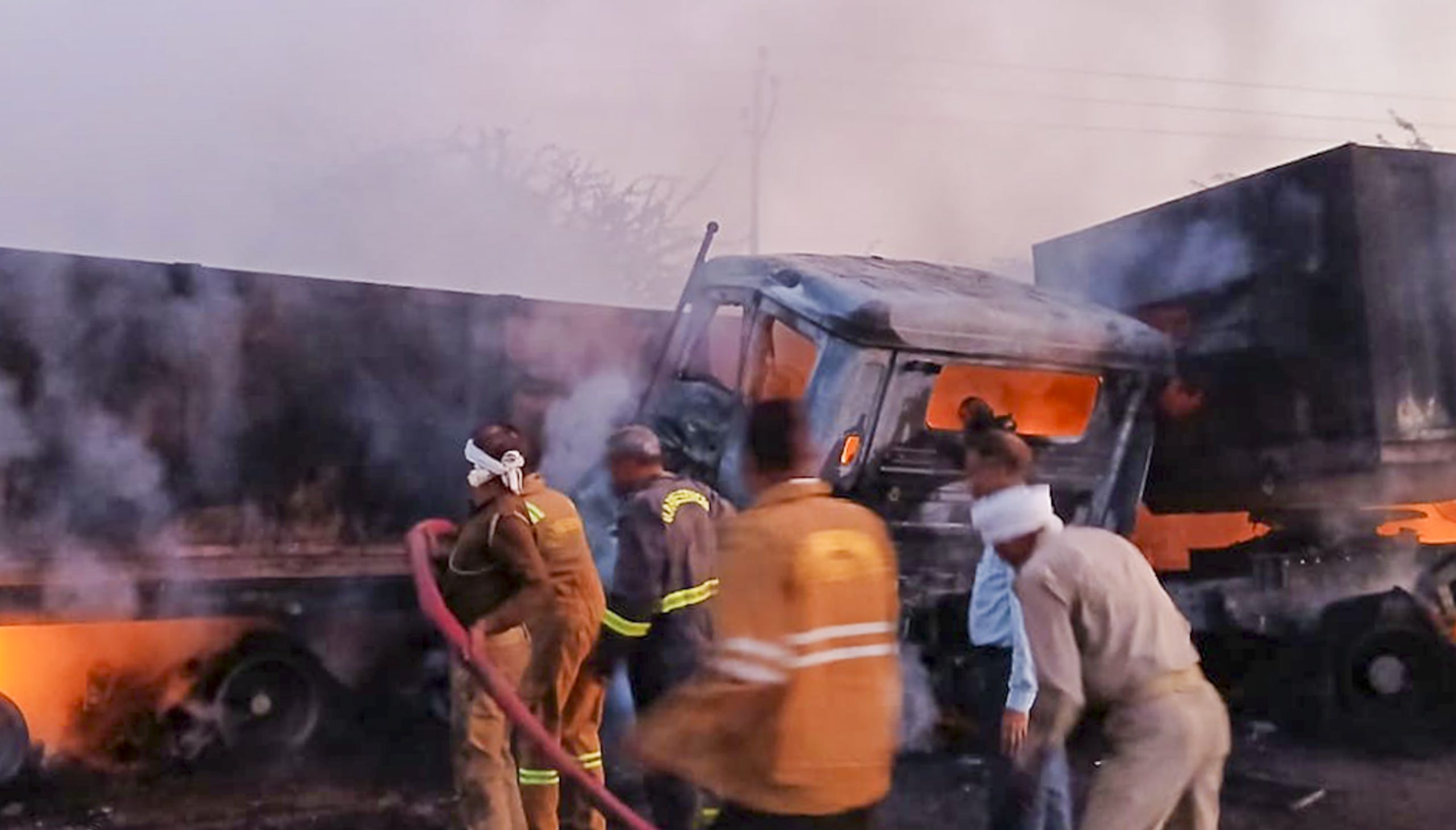 **EDS: THIRD PARTY IMAGE** In this image received on March 26, 2026, Firefighters at the site after two trucks collided head-on and caught fire, in Banda, Uttar Pradesh. Three persons were burnt alive and one man sustained critical injuries in the incident. (Handout via PTI Photo) (PTI03_26_2026_000340B)