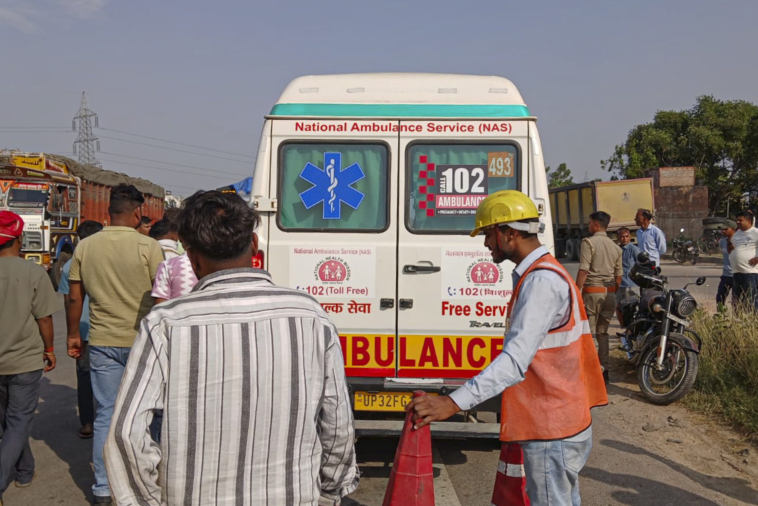 Kaushambi: An ambulance at the site after a pickup truck carrying devotees rammed into a stationary trailer truck on a national highway, killing five women and three children, in Kaushambi district, Friday, March 27, 2026. (PTI Photo) (PTI03_27_2026_000446B)