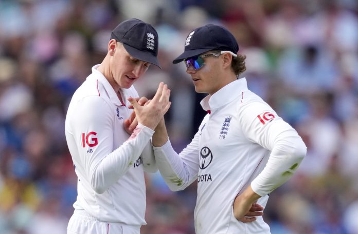 London: England's captain Ollie Pope and teammate Harry Brook during the third day of the fifth Test match between India and England, at The Oval cricket ground, in London, England, Saturday, Aug. 2, 2025. (PTI Photo/R Senthilkumar)(PTI08_02_2025_000455B)