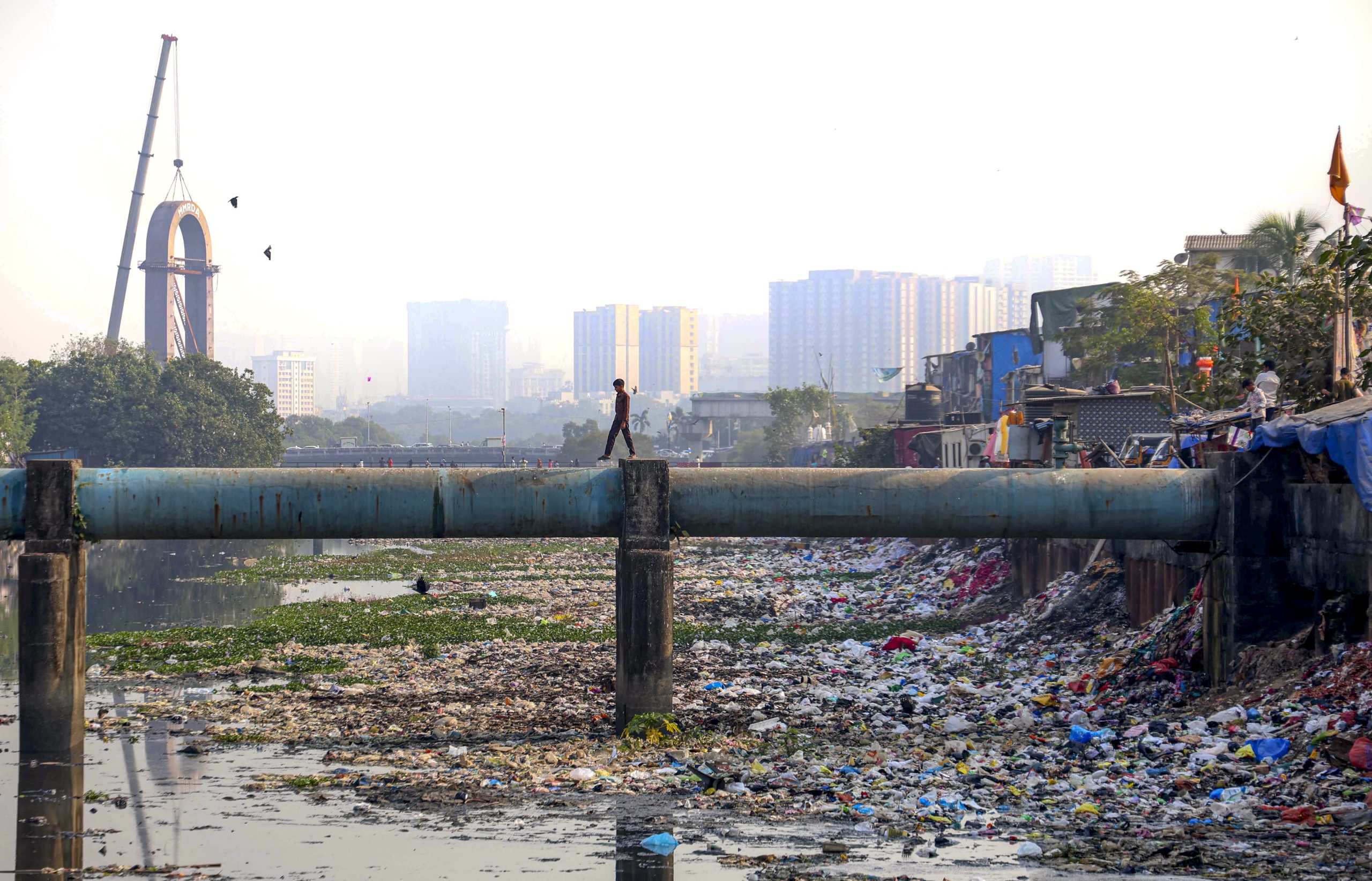 Mumbai: A boy walks on a pipeline over the polluted Mithi River near Bharat Nagar nallah, with high-rise buildings seen in the background, in Mumbai, Friday, Dec. 26, 2025. (PTI Photo)(PTI12_26_2025_000485B)