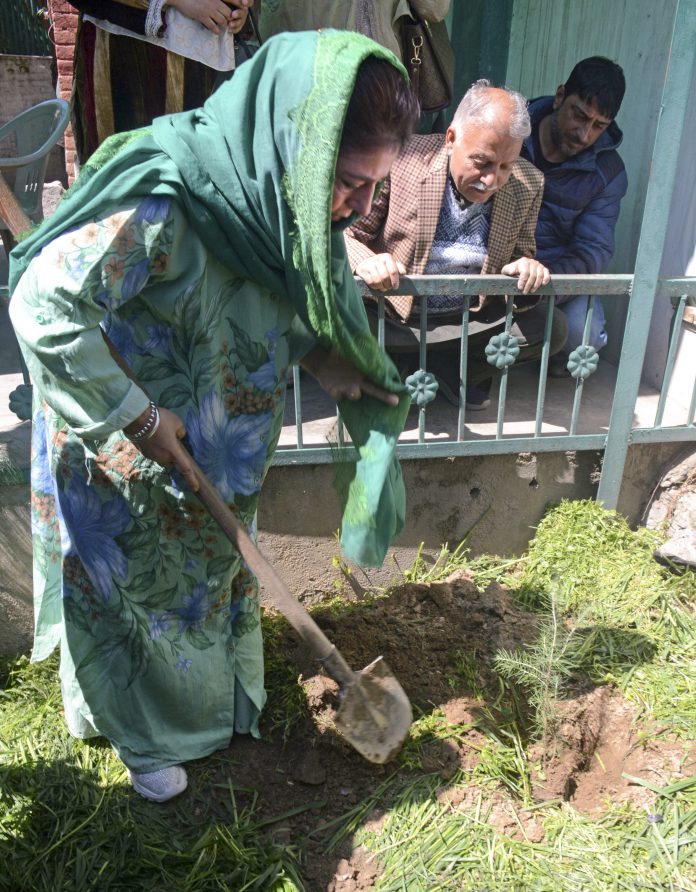 Srinagar: Peoples Democratic Party (PDP) President Mehbooba Mufti plants a sapling during a plantation drive, at the party headquarters, in Srinagar, Wednesday March 25, 2026. (PTI Photo)(PTI03_25_2026_000231B)