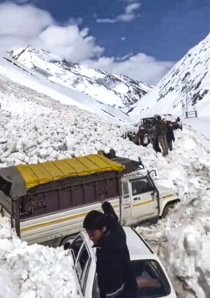 **EDS: THIRD PARTY IMAGE** In this screengrab from a video received on March 27, 2026, vehicles trapped under snow following multiple avalanches that hit the Srinagar-Leh national highway near Zojila Pass, in Jammu and Kashmir. Seven people were killed. (Handout via PTI Photo)(PTI03_28_2026_000016B)