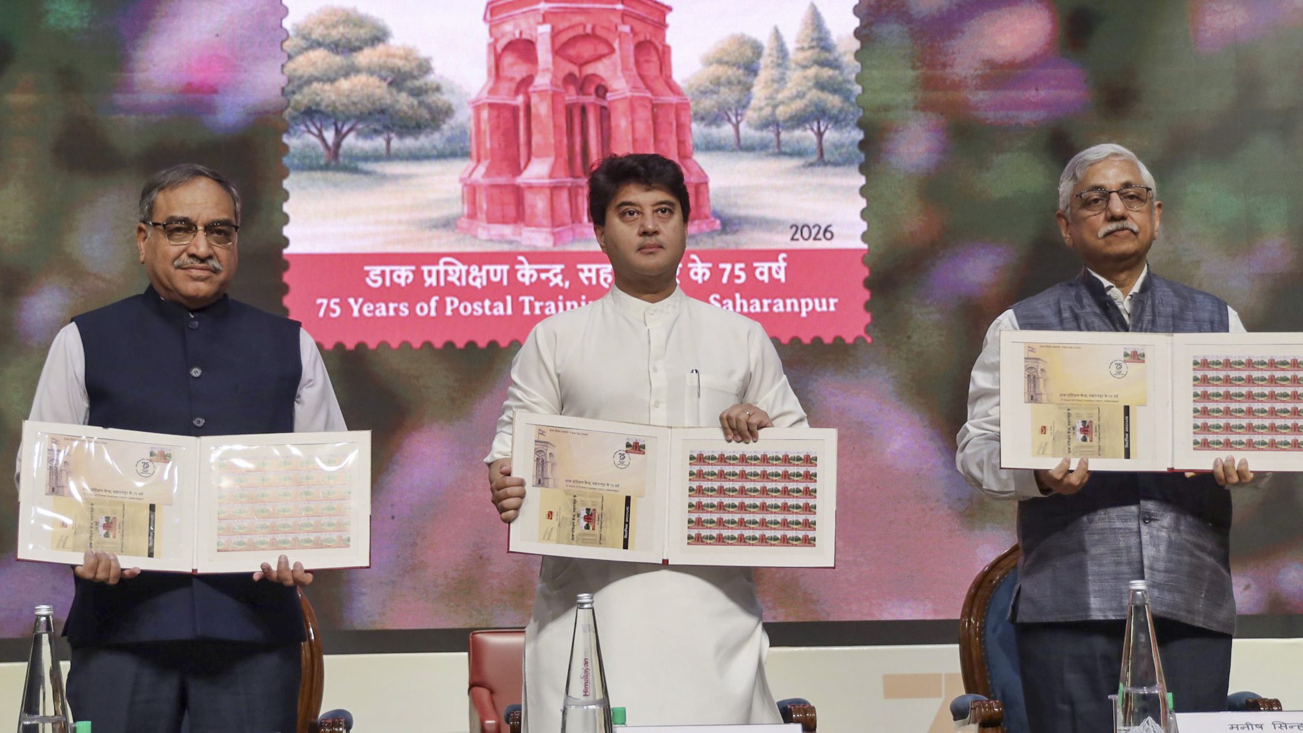 **EDS: THIRD PARTY IMAGE** In this image posted on April 2, 2026, Union Communication Minister Jyotiraditya Scindia releases a commemorative stamp marking 75 years of the Postal Training Centre (PTC) of India Post, in Saharanpur district, Uttar Pradesh. (@JM_Scindia/X via PTI Photo)(PTI04_02_2026_000264B)