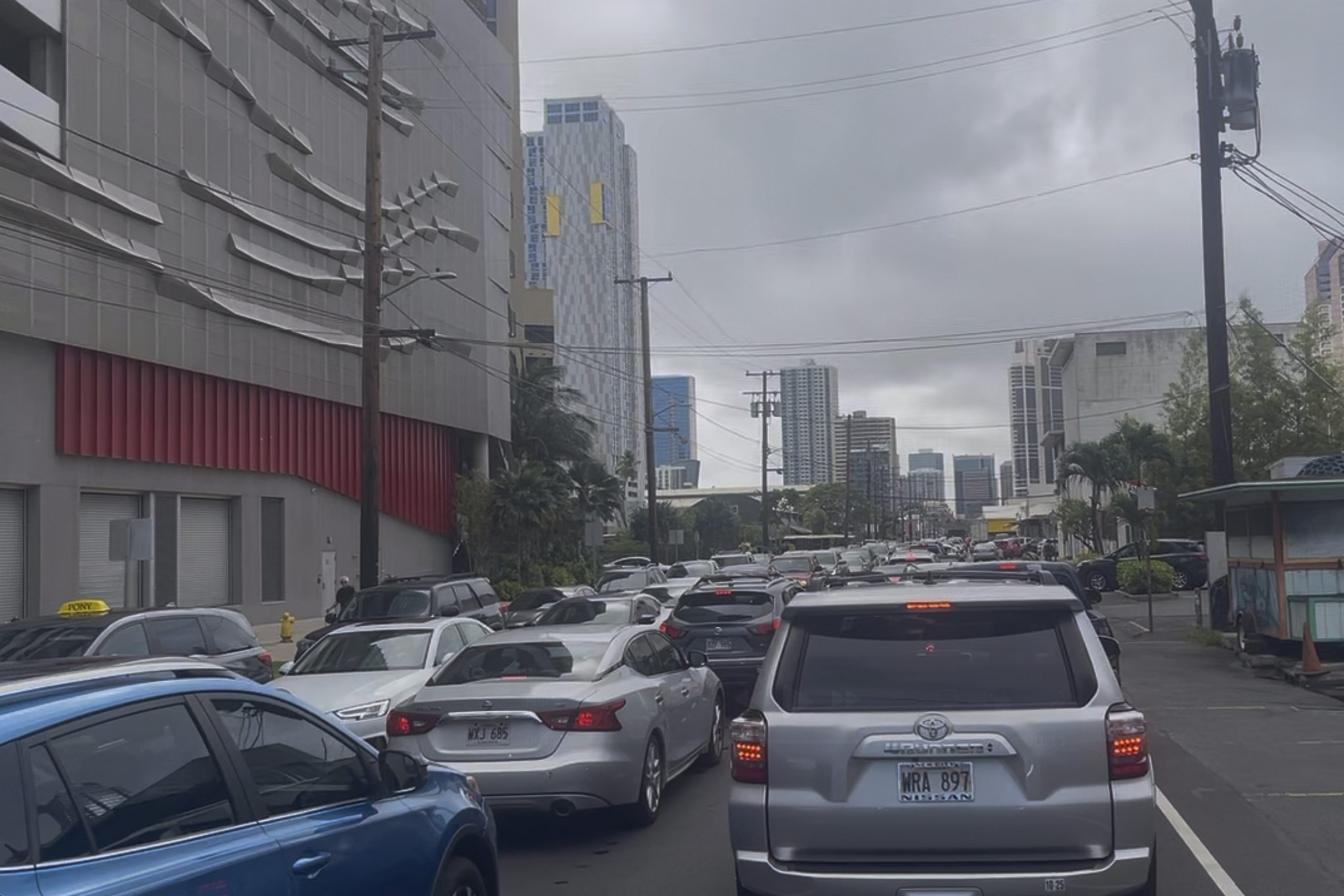 Cars jammed streets and highways in Honolulu as the tsunami alerts coincided with the Tuesday afternoon rush-hour. Warning sirens blared as people moved to higher ground. Hawaii schools cancelled after-school and evening activities.