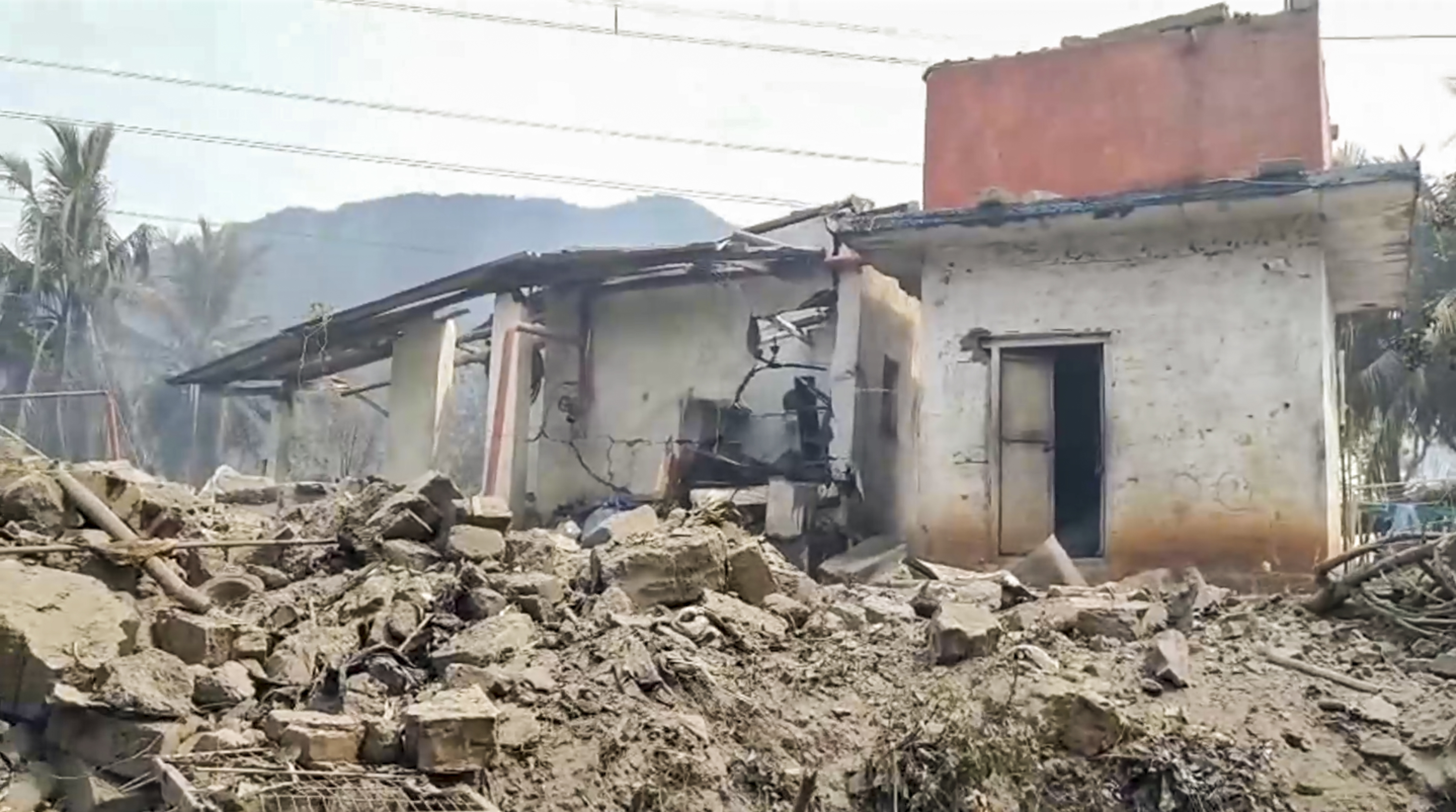 **EDS: SCREENGRAB VIA PTI VIDEOS** Anakapalli: Debris at a firecracker manufacturing unit a fire broke out, in Anakapalli district, Sunday, April 13, 2025. Eight people, including two women, were killed and seven others injured in the accident in Anakapalli district of Andhra Pradesh on Sunday. (PTI Photo) (PTI04_13_2025_000241B)