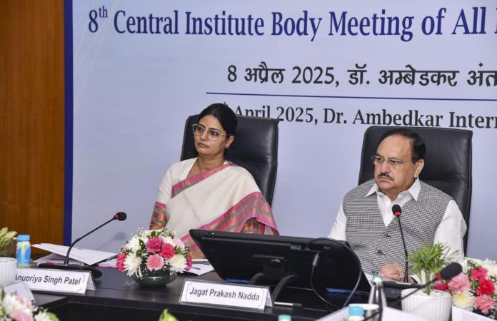 **EDS: THIRD PARTY IMAGE** In this image released by @AnupriyaSPatel via X on April 8, 2025, Union Minister of Health and Family Welfare JP Nadda with MoS Anupriya Patel during the 8th Central Institute Body meeting of AIIMS at Dr. Ambedkar International Centre, in New Delhi. (@AnupriyaSPatel on X via PTI Photo)(PTI04_08_2025_000641B)