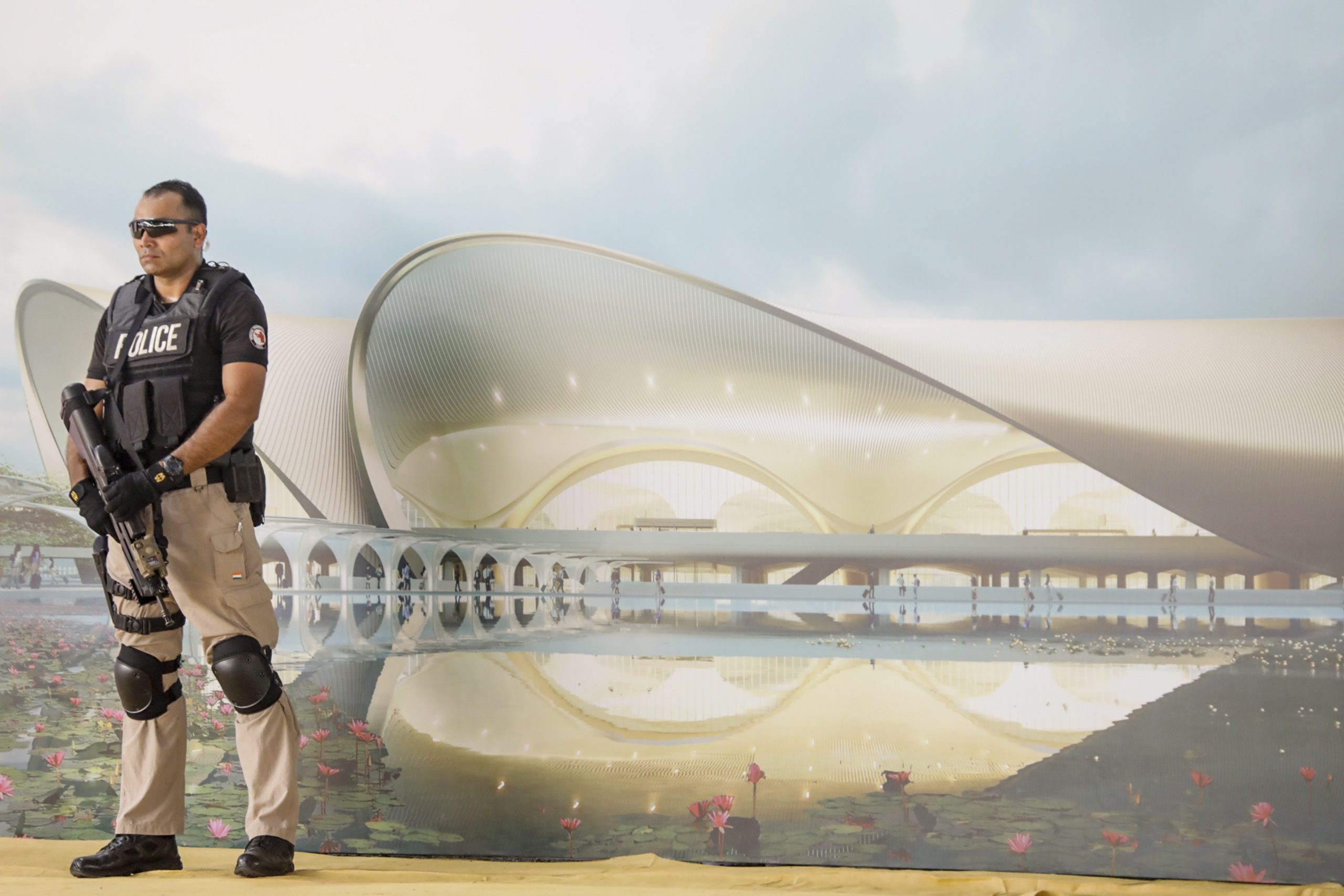 Navi Mumbai: A security official stands guard during the inauguration of phase one of the Navi Mumbai International Airport, in Navi Mumbai, Wednesday, Oct. 8, 2025. (PTI Photo) (PTI10_08_2025_000486B)