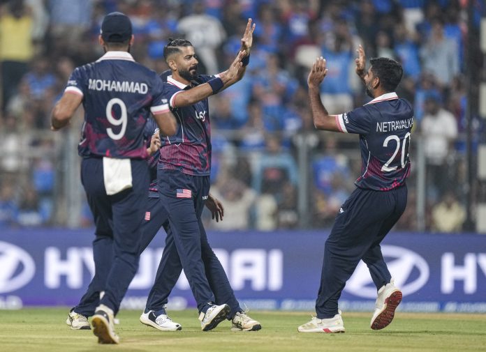 Mumbai: USA's Ali Khan and Saurabh Netravalkar celebrate the dismissal of India's Abhishek Sharma during the ICC Men's T20 World Cup 2026 cricket match between India and USA, at the Wankhede Stadium, in Mumbai, Saturday, Feb. 7, 2026. (PTI Photo/Kunal Patil)(PTI02_07_2026_000542B)