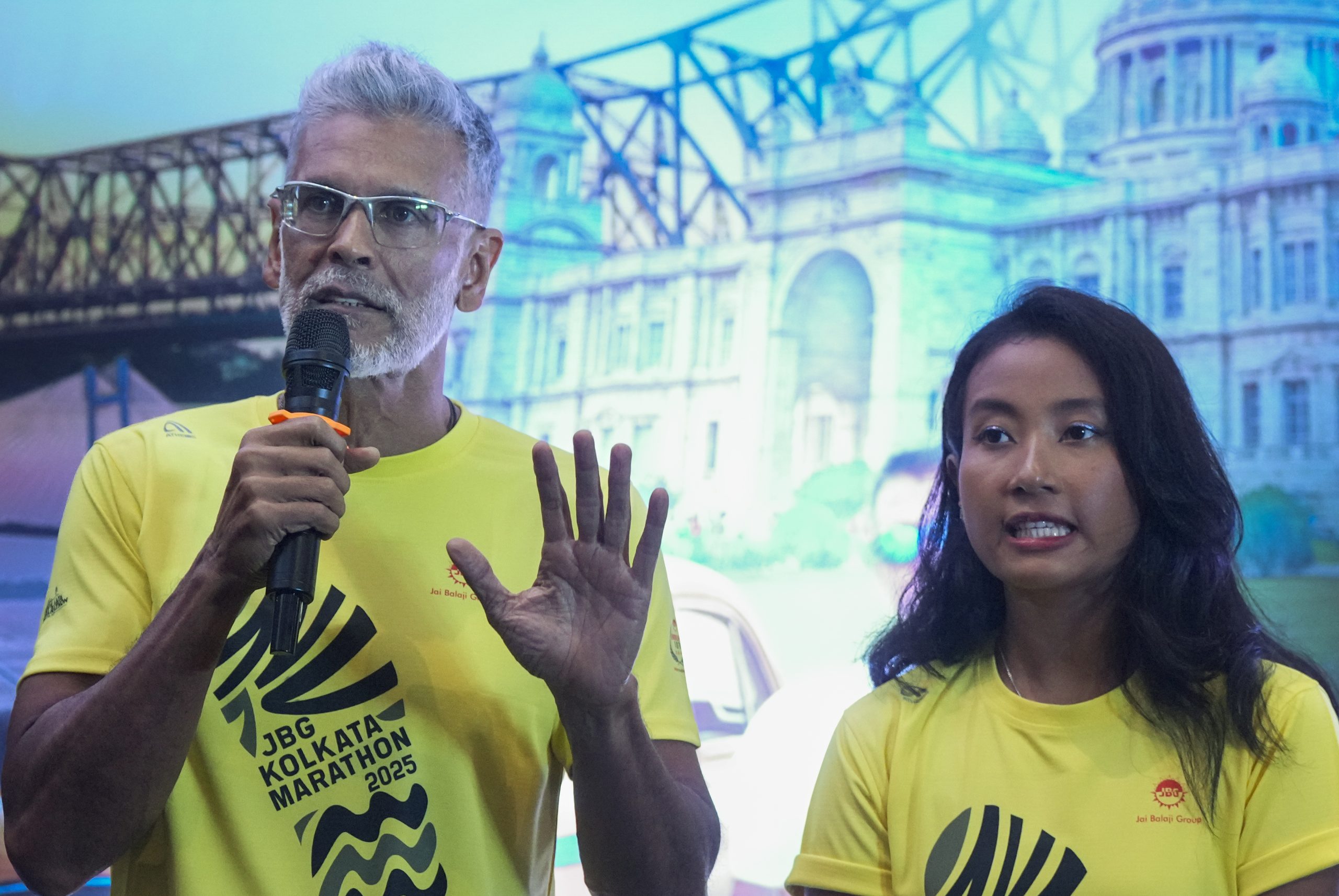Kolkata: Milind Soman, actor, model and Event Ambassador of JBG Kolkata Marathon 2025, with his wife and triathlete Ankita Konwar during unveiling of participants' t-shirt and finisher medal of JBG Kolkata Marathon 2025, in Kolkata, Tuesday, Oct. 14, 2025. (PTI Photo/Swapan Mahapatra)(PTI10_14_2025_000204B)