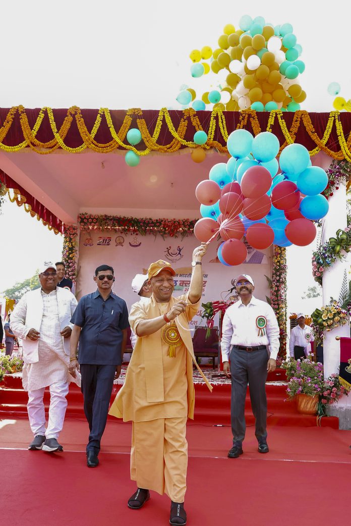 **EDS: THIRD PARTY IMAGE** In this image released by @myogiadityanath via X on Monday, April 7, 2025, Uttar Pradesh Chief Minister Yogi Adityanath during the inauguration of the first All India Police Handball Cluster 2024-25, in Lucknow. (@myogiadityanath on X via PTI Photo)(PTI04_07_2025_000266B)