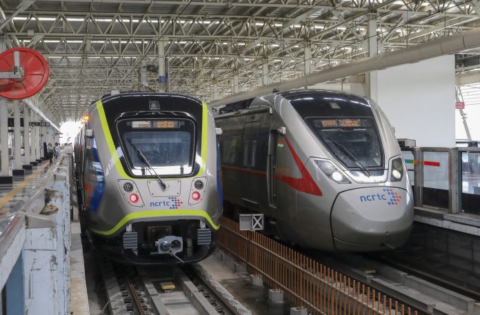 Meerut: A Meerut Metro train (right) and Namo Bharat train during a press preview ahead of the inauguration of the 82km Delhi-Meerut Regional Rapid Transit System (RRTS) corridor, at Meerut South metro station, in Uttar Pradesh, Wednesday, Sept. 10, 2025. The Meerut Metro to share infrastructure and operate on the same corridor as Delhi-Meerut RRTS line. (PTI Photo)(PTI09_10_2025_000275B)
