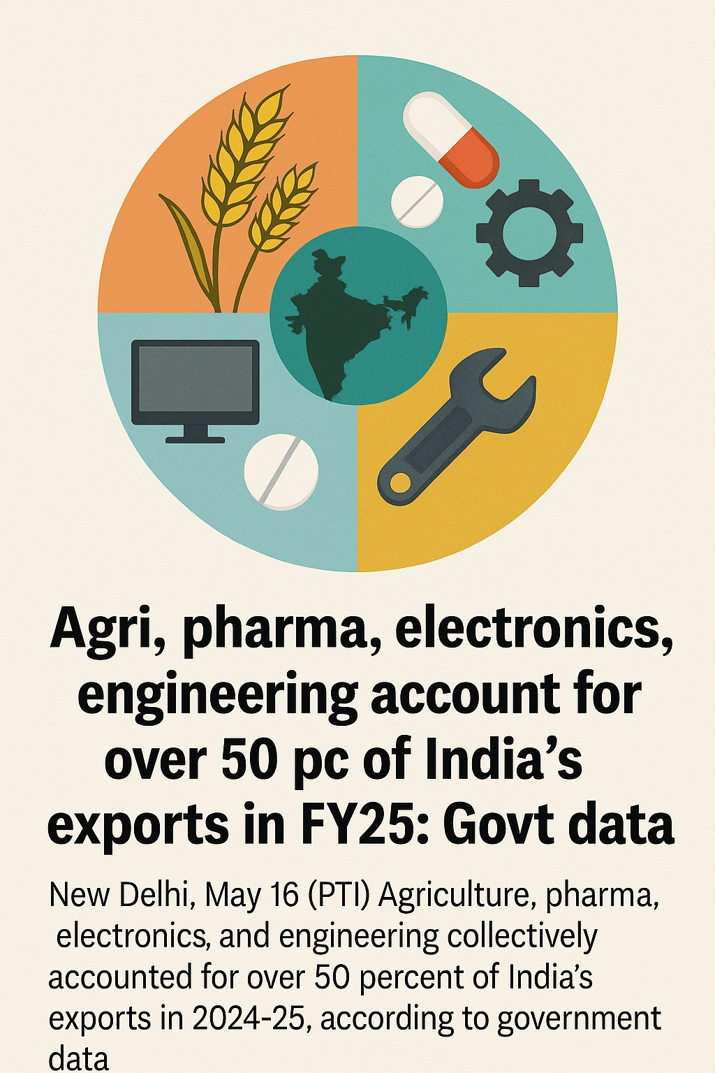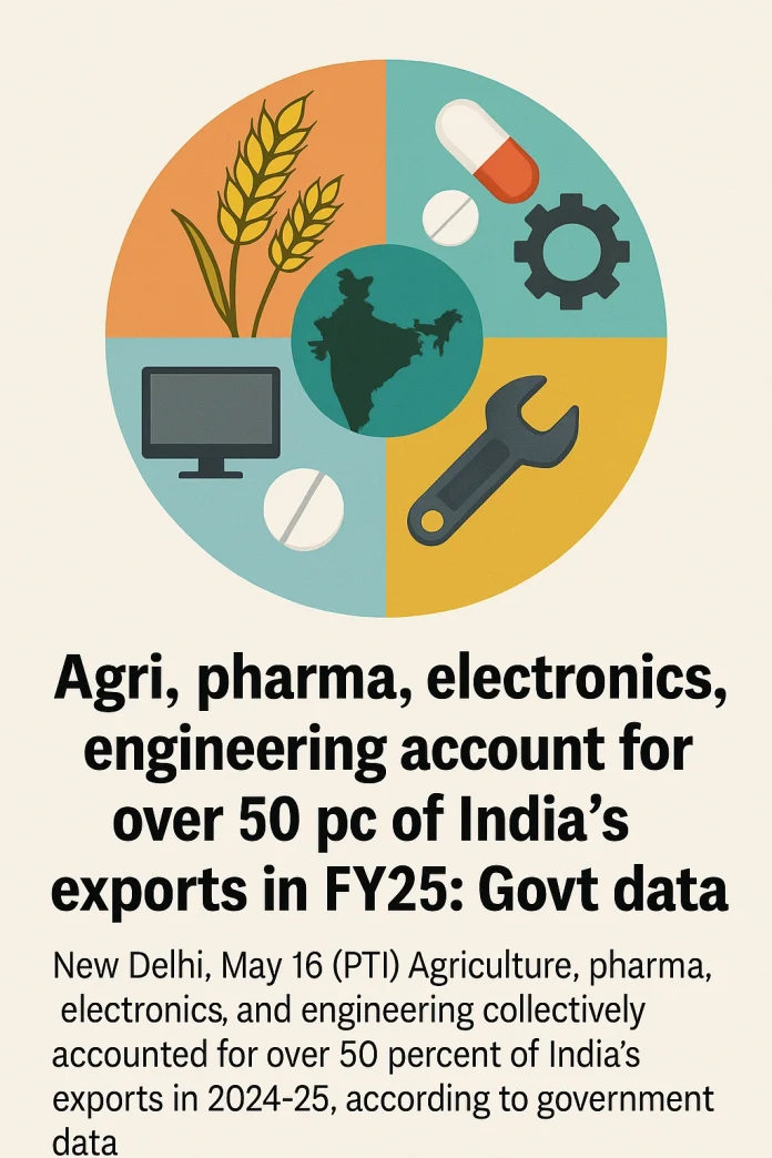 New Delhi, May 16 (PTI) Agriculture, pharma, electronics, and engineering goods together accounted for over 50 per cent of India’s merchandise exports in 2024-25, according to government data, highlighting the country’s growing strength in diverse sectors amid efforts to boost manufacturing and value-added exports.