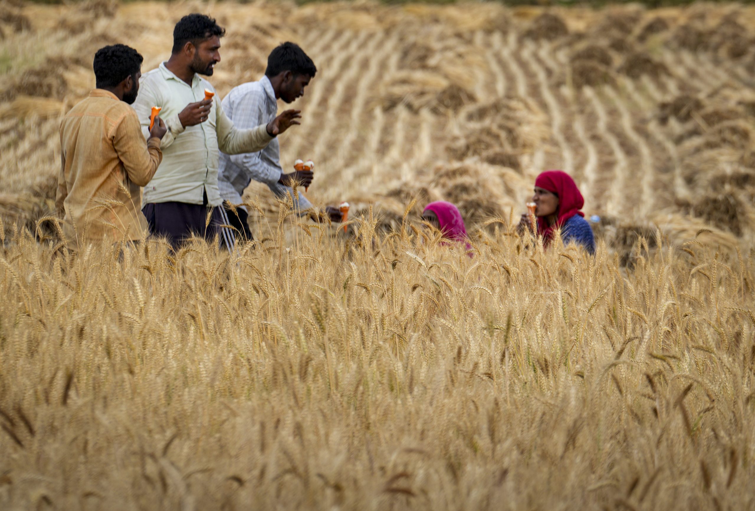 Loharu: Workers eat ice creams during a break while harvesting wheat crop at a farm, in Loharu, Haryana, Tuesday, March 31, 2026. (PTI Photo/Kamal Kishore)(PTI04_01_2026_000066B)