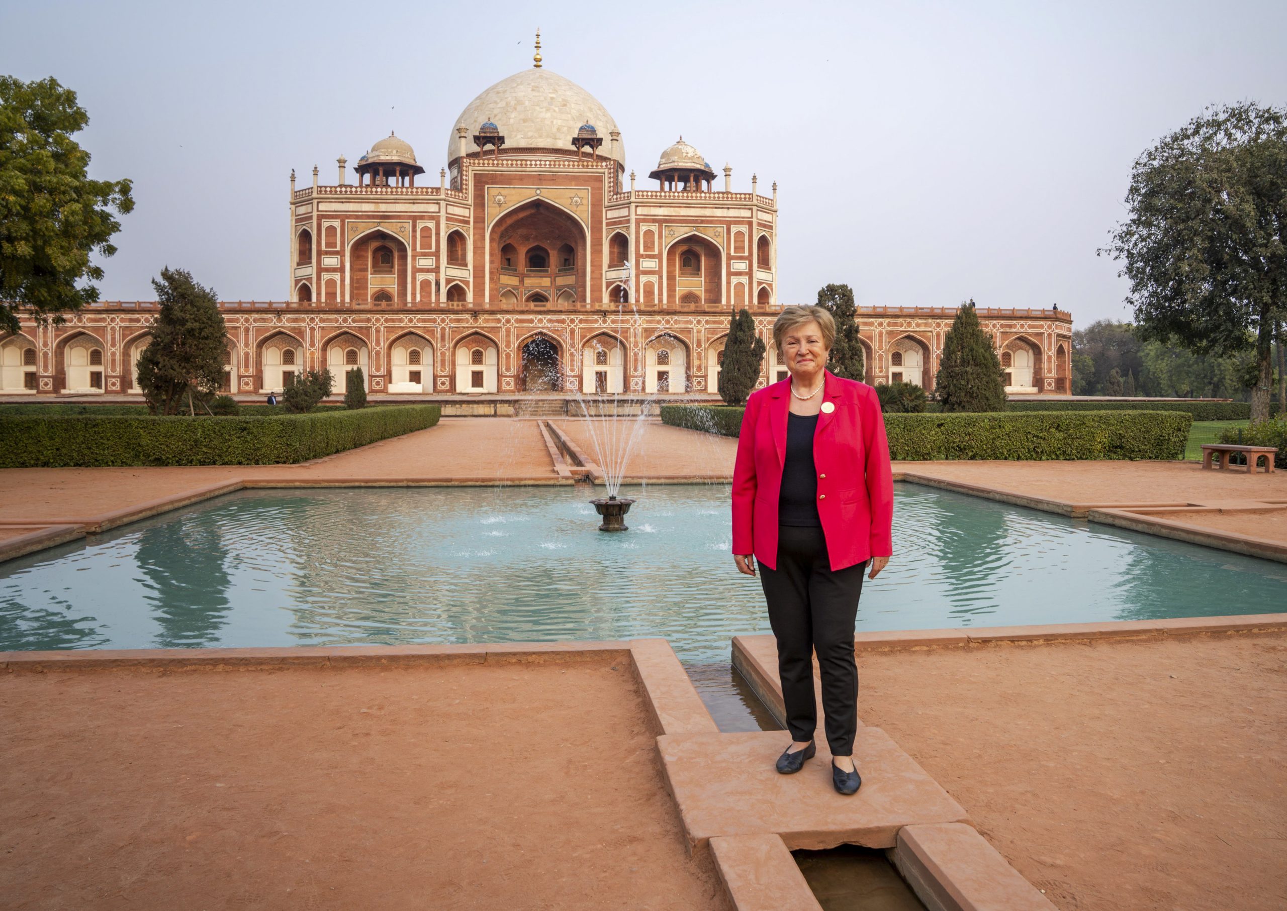**EDS: THIRD PARTY IMAGE** In this image posted on Feb. 19, 2026, International Monetary Fund (IMF) chief Kristalina Georgieva poses for photographs during a visit to the Humayun’s Tomb, in New Delhi. (@KGeorgieva/X via PTI Photo) (PTI02_19_2026_000766B)