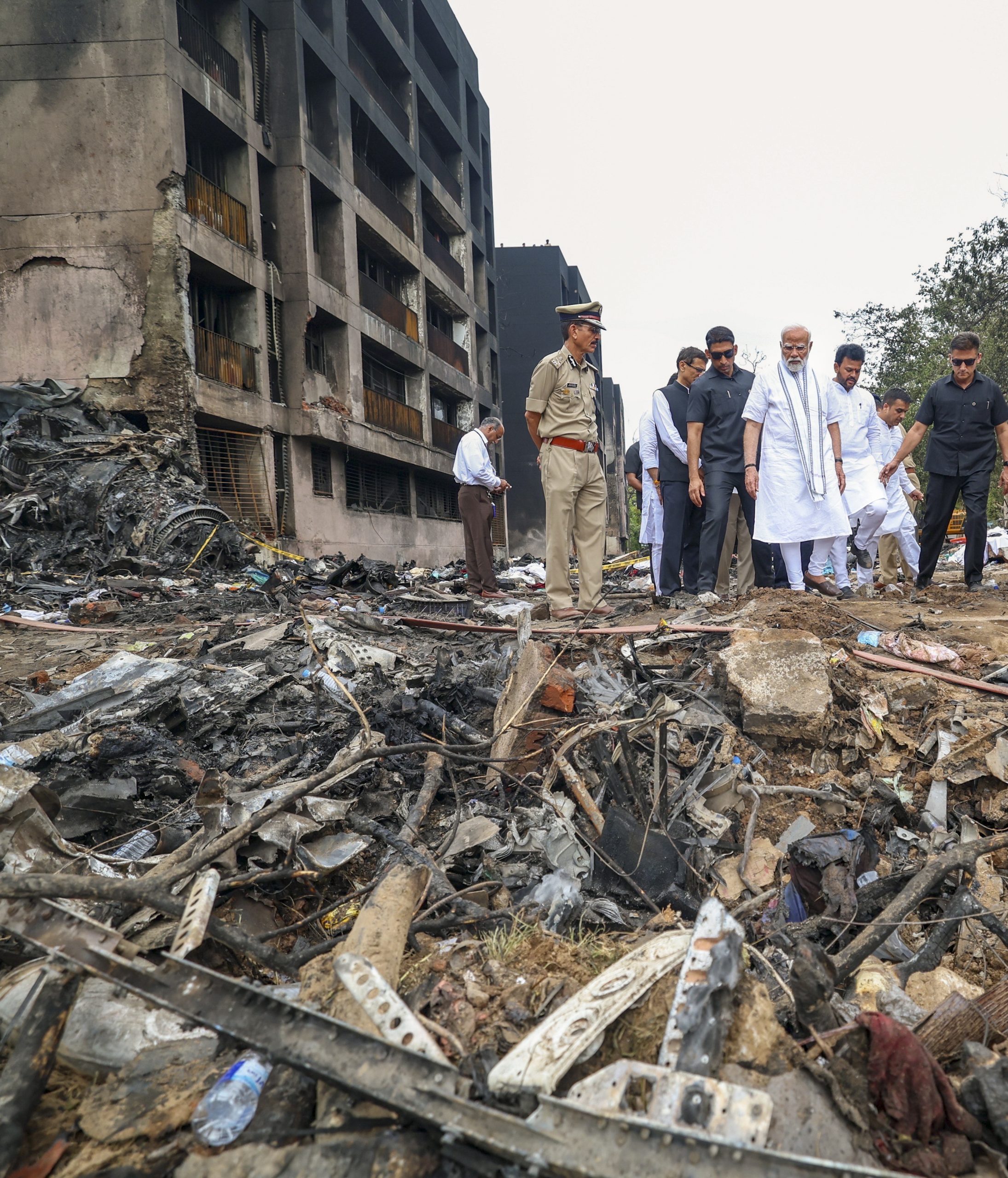 **EDS: THIRD PARTY IMAGE** Ahmedabad: In this image via PMO, Prime Minister Narendra Modi with Civil Aviation Minister Rammohan Naidu visits the site of the Air India plane crash, in Ahmedabad, Friday, June 13, 2025. A London-bound Air India plane carrying 242 passengers crashed moments after taking off from the Ahmedabad airport on Thursday. (PMO via PTI Photo)(PTI06_13_2025_000090B)