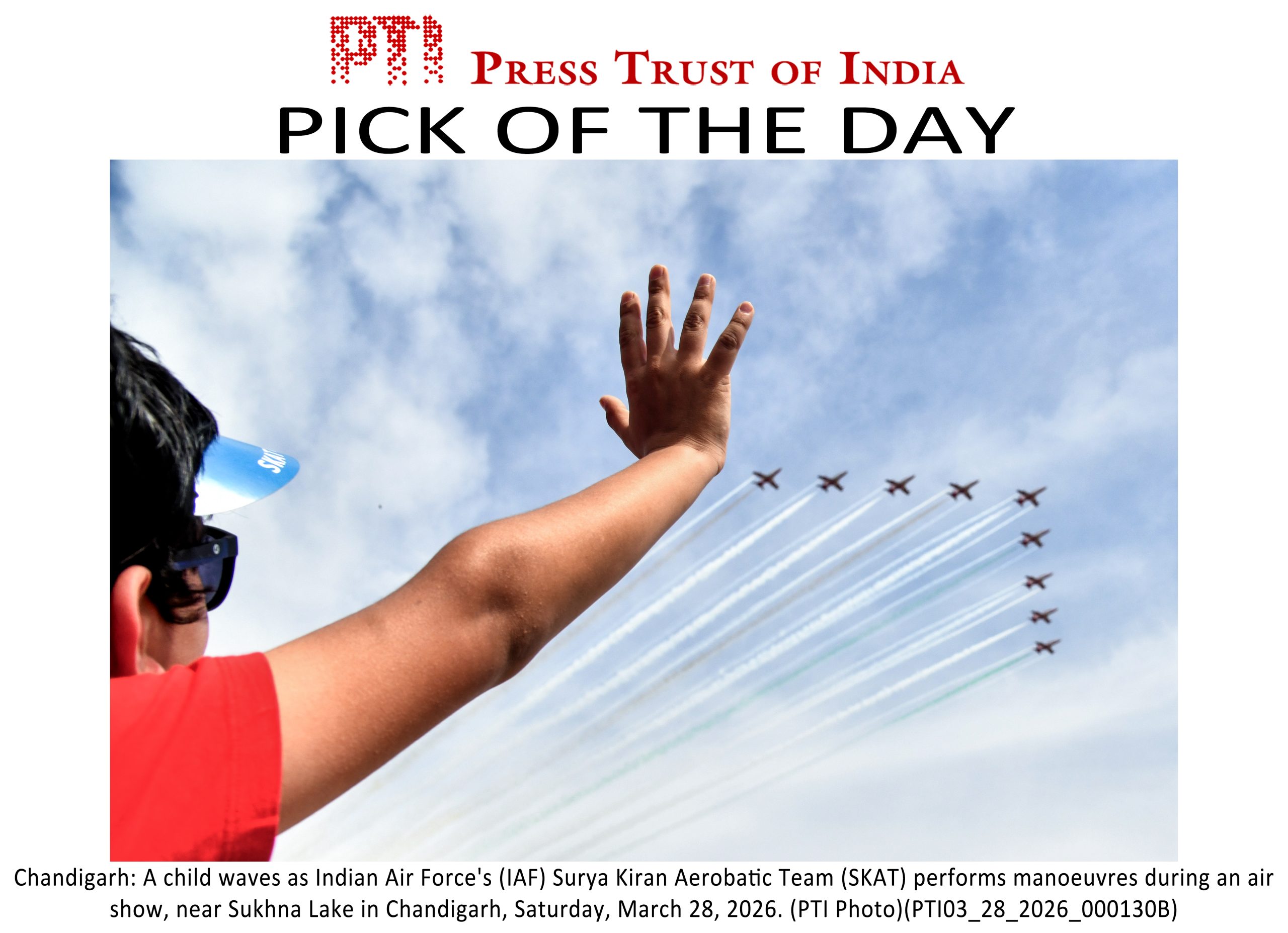 PLS TAKE NOTE OF THIS PTI PICK OF THE DAY::: Chandigarh: A child waves as Indian Air Force’s (IAF) Surya Kiran Aerobatic Team (SKAT) performs manoeuvres during an air show, near Sukhna Lake in Chandigarh, Saturday, March 28, 2026. (PTI Photo)(PTI03_28_2026_000130B)(PTI03_28_2026_000276B)