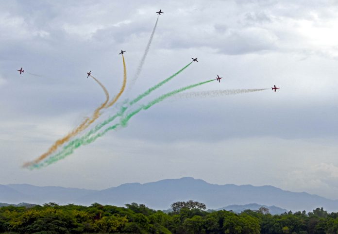 Chandigarh: Indian Air Force’s (IAF) Surya Kiran Aerobatic Team (SKAT) performs manoeuvres during an air show, near Sukhna Lake in Chandigarh, Friday, March 27, 2026. (PTI Photo) (PTI03_27_2026_000204B)