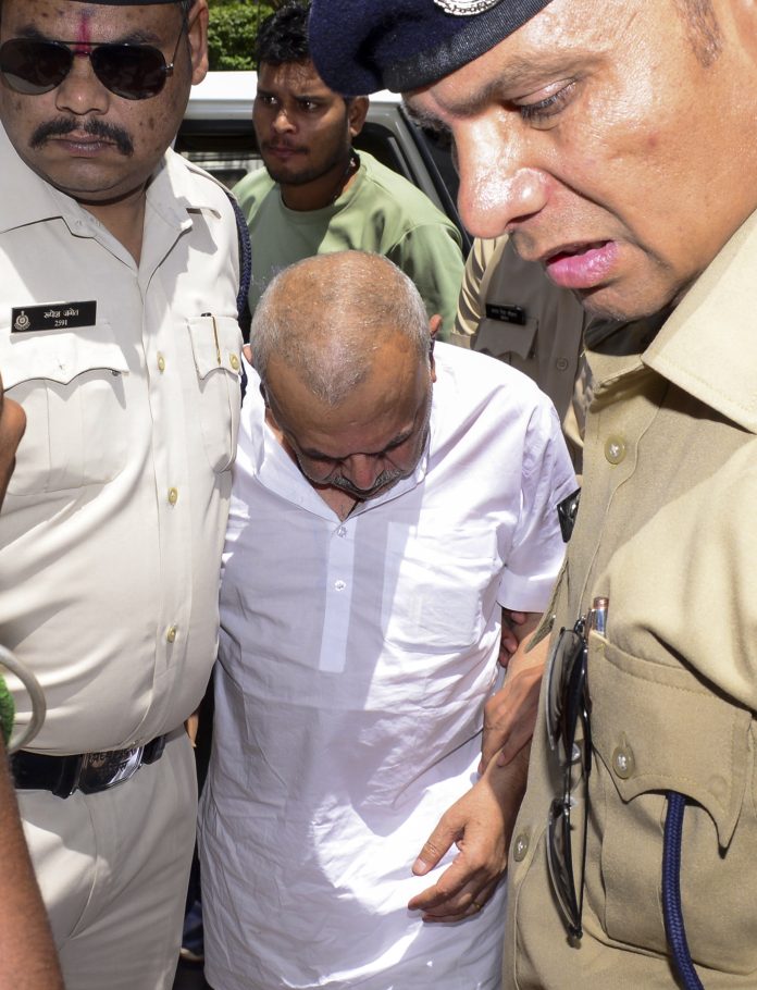 Jabalpur: Akhilesh Maben, Chairman of Joy Senior Secondary School, being escorted by police to a control room, in Jabalpur, Sunday, April 6, 2025. Maben was arrested in Kochi with the help of the Airport Authority of India this morning. (PTI Photo) (PTI04_06_2025_000243B)