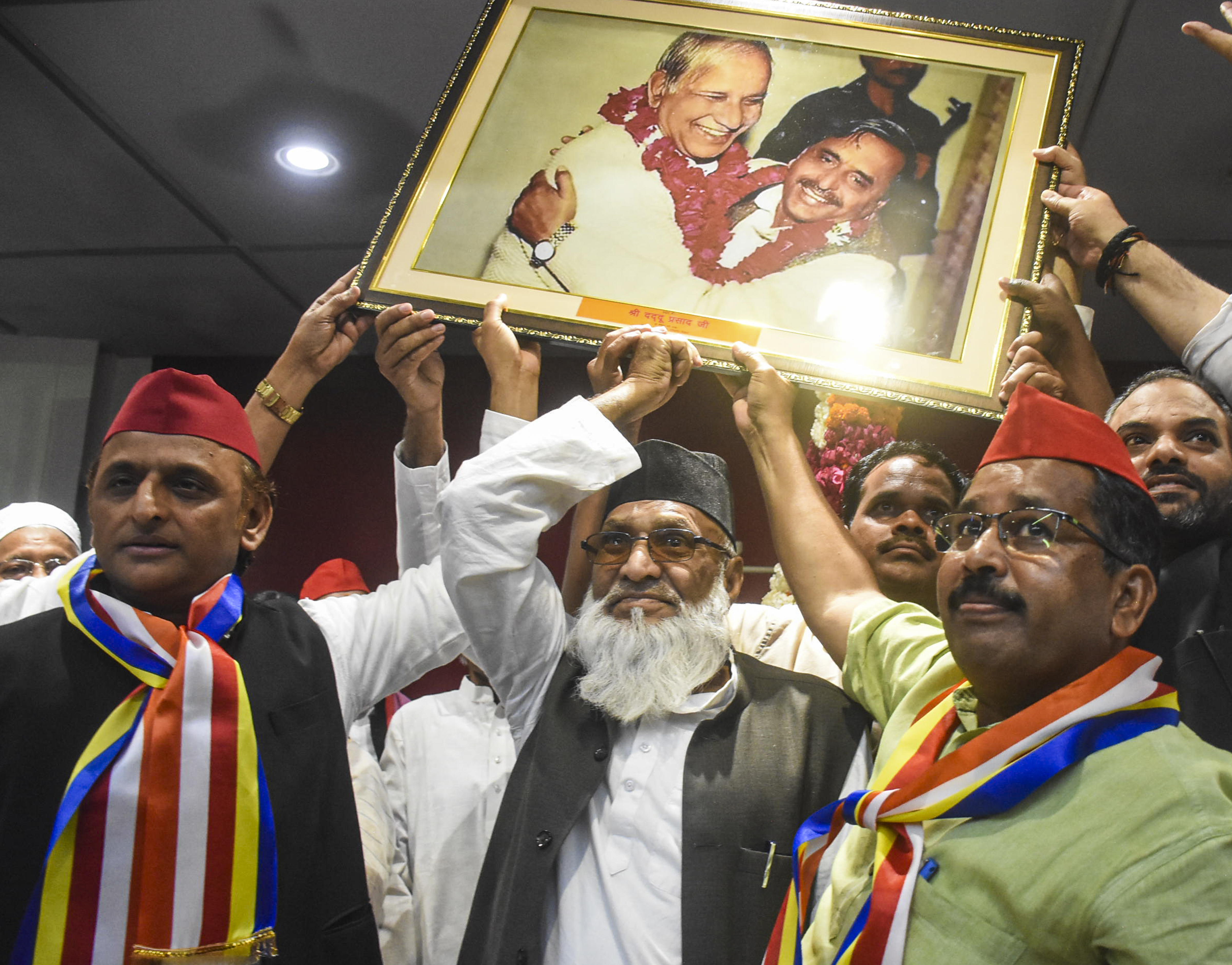 Lucknow: Samajwadi Party President Akhilesh Yadav, left, during a press conference, in Lucknow, Monday, April 7, 2025. (PTI Photo/Nand Kumar)(PTI04_07_2025_000118B)