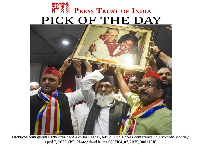 PLS TAKE NOTE OF THIS PTI PICK OF THE DAY::: Lucknow: Samajwadi Party President Akhilesh Yadav, left, during a press conference, in Lucknow, Monday, April 7, 2025. (PTI Photo/Nand Kumar)(PTI04_07_2025_000118B)(PTI04_07_2025_000259B)