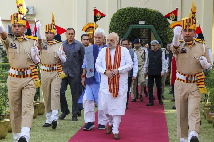 Jammu: Union Home Minister Amit Shah and J&K Lt. Governor Manoj Sinha during a ceremony organised to honour the martyrs of Jammu and Kashmir Police, at Raj Bhavan, in Jammu, Monday, April 7, 2025. (PTI Photo)(PTI04_07_2025_000161B)