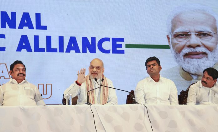 Chennai: Union Home Minister Amit Shah with AIADMK general secretary Edappadi K Palaniswami and Tamil Nadu BJP President K Annamalai during a press conference, in Chennai, Friday, April 11, 2025. AIADMK and BJP announced alliance for Tamil Nadu’s 2026 polls while Nainar Nagendran is all set to become the next state chief of the BJP, succeeding K Annamalai. (PTI Photo)