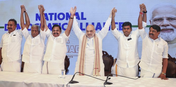 Chennai: Union Home Minister Amit Shah with AIADMK general secretary Edappadi K Palaniswami, Tamil Nadu BJP President K Annamalai and others during a press conference, in Chennai, Friday, April 11, 2025. AIADMK and BJP announced alliance for Tamil Nadu’s 2026 polls while Nainar Nagendran is all set to become the next state chief of the BJP, succeeding K Annamalai. (PTI Photo)