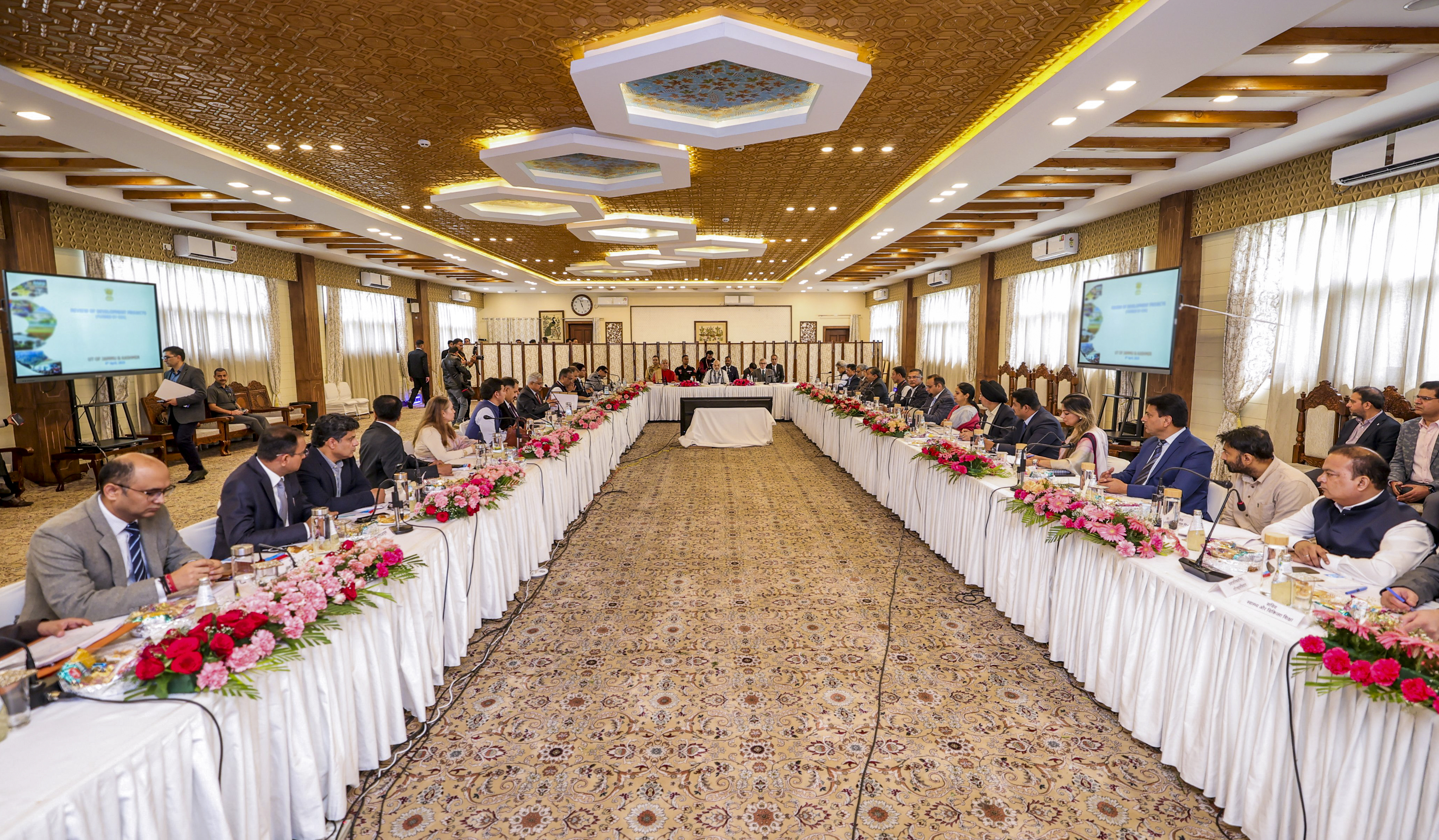 **EDS: THIRD PARTY IMAGE** In this image released by @AmitShah via X on April 8, 2025, Union Home Minister Amit Shah, J&K Lt. Governor Manoj Sinha and Chief Minister Omar Abdullah during a meeting to review the development projects in Jammu & Kashmir. (@AmitShah on X via PTI Photo)(PTI04_08_2025_000401B)