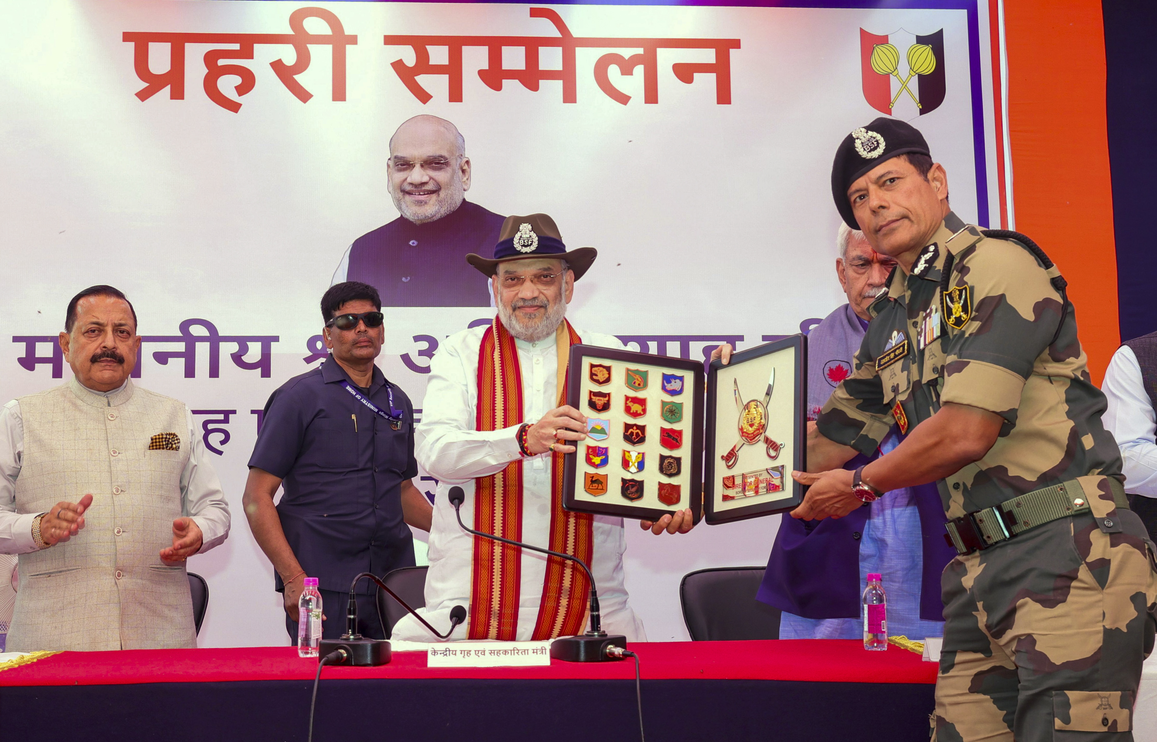 **EDS: THIRD PARTY IMAGE** In this image released by @AmitShah via X on Monday, April 7, 2025, Union Home Minister Amit Shah during an interaction with BSF soldiers in Jammu and Kashmir. Shah also inaugurated various border security related works. (@AmitShah on X via PTI Photo)(PTI04_07_2025_000361B)