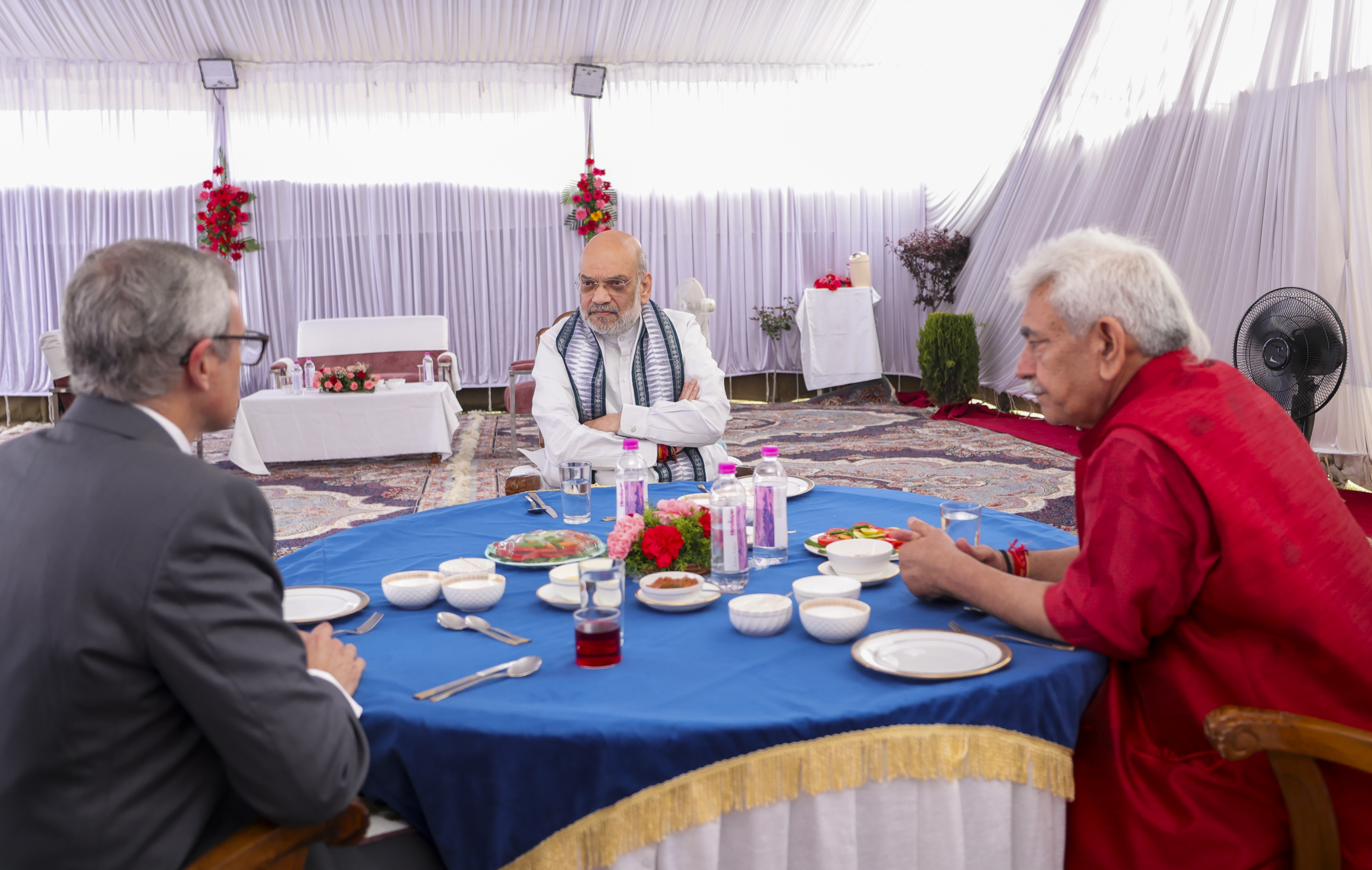 **EDS: THIRD PARTY IMAGE** In this handout image made available on April 8, 2025, Union Home Minister Amit Shah with J&K Lt. Governor Manoj Sinha and Chief Minister Omar Abdullah during a meeting, in Srinagar. (PTI Photo)(PTI04_08_2025_000311B)