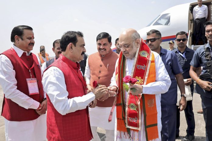 **EDS: THIRD PARTY IMAGE** In this image released by @drnarottammisra via X on April 13, 2025, Union Home Minister Amit Shah being welcomed by Madhya Pradesh Chief Minister Mohan Yadav and BJP leader Narottam Mishra upon his arrival in Bhopal. (@drnarottammisra via PTI Photo)(PTI04_13_2025_000126B)