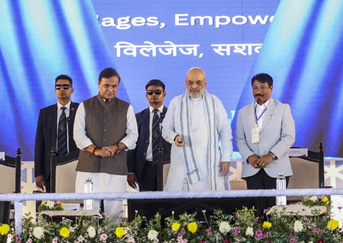 **EDS: THIRD PARTY IMAGE** In this image posted on Feb. 20, 2026, Union Home Minister Amit Shah during the launch of the Vibrant Villages Programme-II, in Cachar district of Assam, Friday, Feb. 20, 2026. Assam Chief Minister Himanta Biswa Sarma and Minister Atul Bora are also seen. (@CMOfficeAssam/X via PTI Photo)(PTI02_20_2026_000202B) *** Local Caption ***