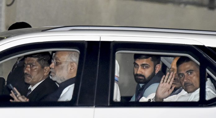 Kolkata: Union Home Minister Amit Shah, front left, BJP leader and Leader of Opposition in West Bengal Assembly Suvendu Adhikari, front right, and others after the former’s arrival at Netaji Subhas Chandra Bose International (NSCBI) Airport, in Kolkata, Friday, Jan. 30, 2025. (PTI Photo) (PTI01_30_2026_000395B)