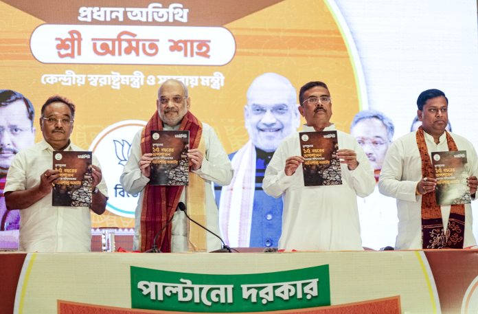 Kolkata: Union Home Minister Amit Shah releases a ‘charge sheet’ against the TMC government, in Kolkata, West Bengal, Saturday, March 28, 2026. LoP in the West Bengal Assembly Suvendu Adhikari, MoS Sukanta Majumdar, and state party president Samik Bhattacharya are also seen. (PTI Photo/Swapan Mahapatra)(PTI03_28_2026_000105B)