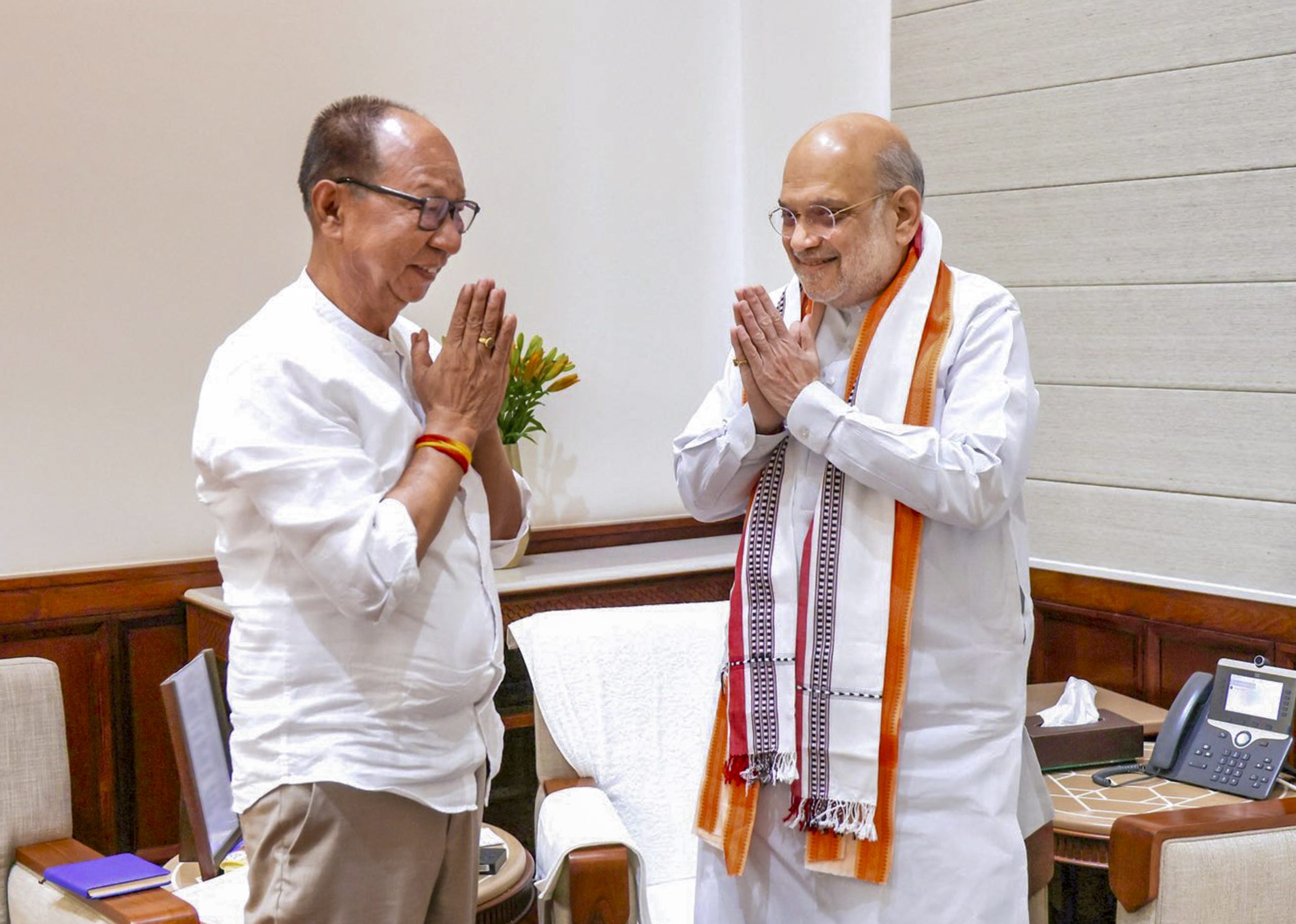 **EDS: THIRD PARTY IMAGE** In this image posted on April 1, 2026, Union Home Minister Amit Shah with Manipur Chief Minister Yumnam Khemchand Singh during a meeting. (@HMOIndia/X via PTI Photo) (PTI04_01_2026_000588B)