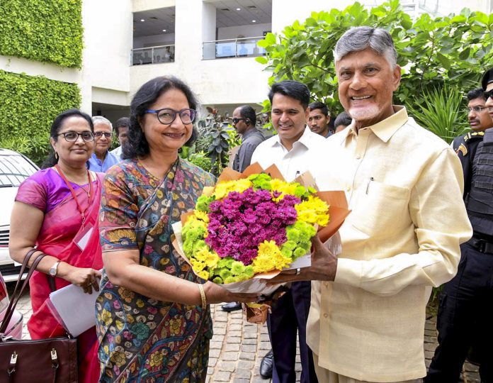 **EDS: THIRD PARTY** In this image posted by @JaiTDP via X on April 16, 2025, Andhra Pradesh Chief Minister N Chandrababu Naidu receives the member of the 16th Finance Commission on her arrival in the state. (@JaiTDP via PTI Photo) (PTI04_16_2025_000179B)