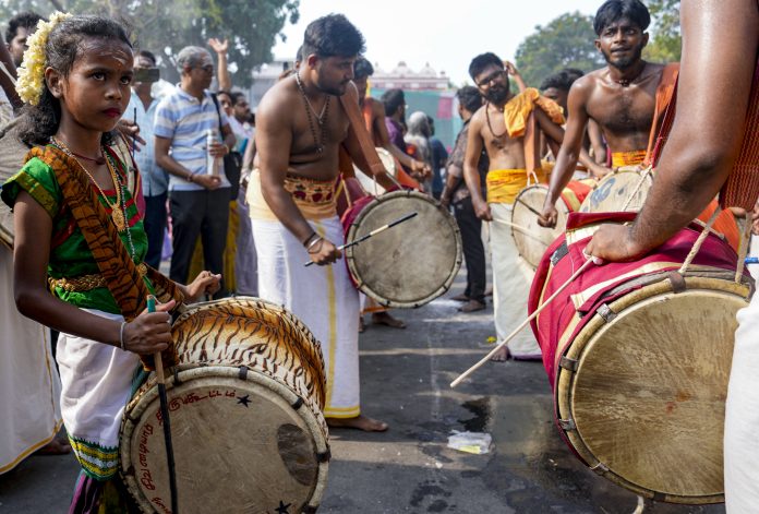 Chennai: Artists perform during the annual car festival of the ‘Kapaleeshwarar Temple’ at Mylapore, in Chennai, Tamil Nadu, Sunday, March 29, 2026. (PTI Photo/R Senthilkumar)(PTI03_29_2026_000138B)