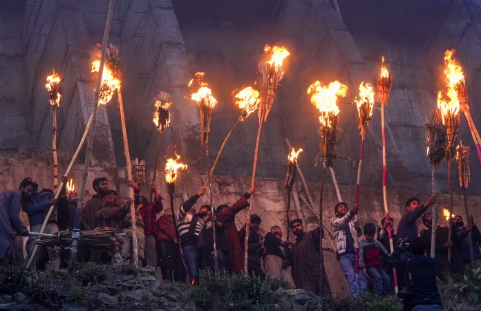 Anantnag: Muslim devotees carrying torches gather outside the shrine of Sufi saint Sakhi Zain-ud-Din Wali on a hillock during the annual torch festival, which symbolises the victory of good over evil, at Aishmuqam, in Anantnag district, Jammu & Kashmir, Saturday, April 12, 2025. (PTI Photo/S Irfan)(PTI04_13_2025_000159B)